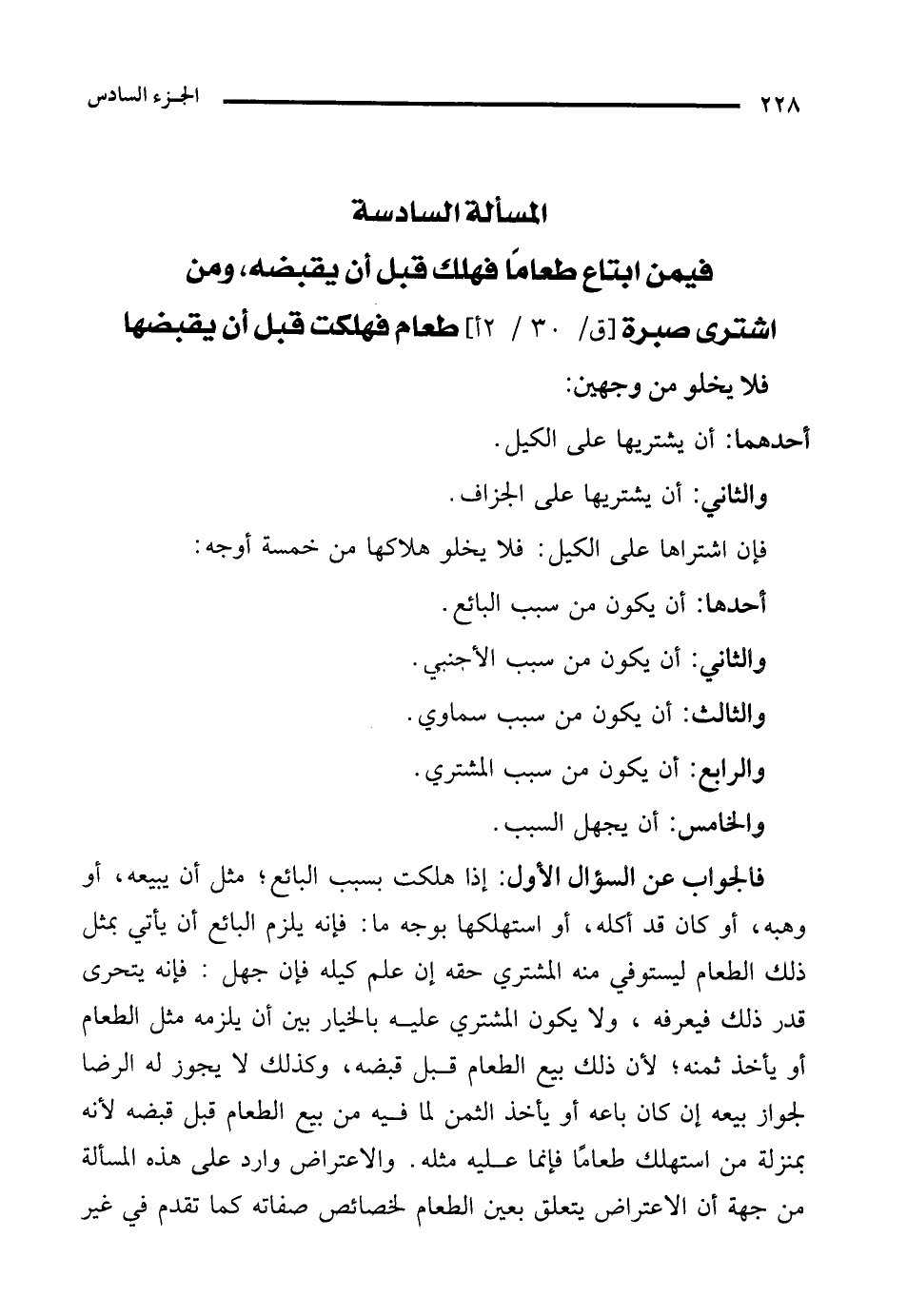 المسألة السادسة فيمن ابتاع طعامًا فهلك قبل أن يقبضه، ومن اشترى صبرة طعام فهلكت قبل أن يقبضها
