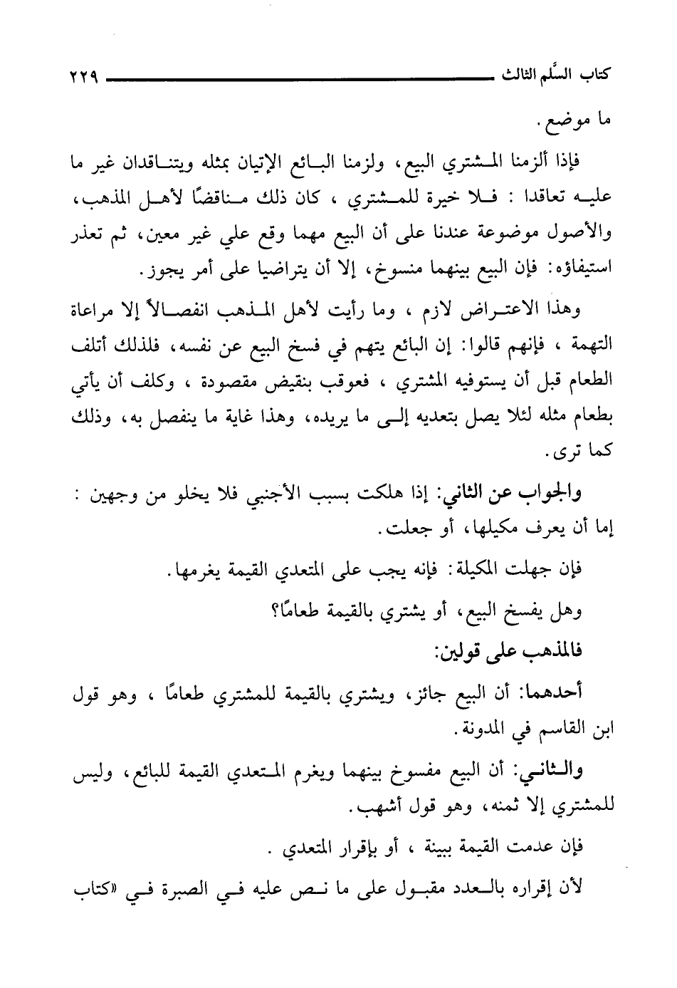 فإذا ألزمنا المشتري البيع، ولزمنا البائع الإتيان بمثله ويتناقدان غير ما عليه تعاقدا: فلا خيرة للمشتري، كان ذلك مناقضًا لأهل المذهب، والأصول موضوعة عندنا على أن البيع مهما وقع علي غير معين، ثم تعذر استيفاؤه: فإن البيع بينهما منسوخ، إلا أن يتراضيا على أمر يجوز.