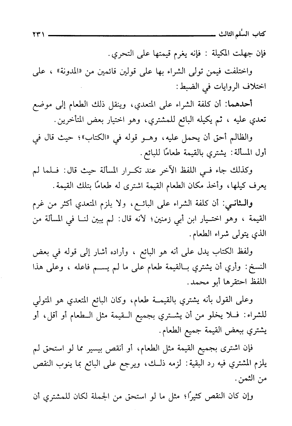 ولفظ الكتاب يدل على أنه هو البائع، وأراده أشار إلى قوله في بعض النسخ: وأري أن يشتري بالقيمة طعام على ما لم يسم فاعله، وعلى هذا اللفظ احتقرها أبو محمَّد.