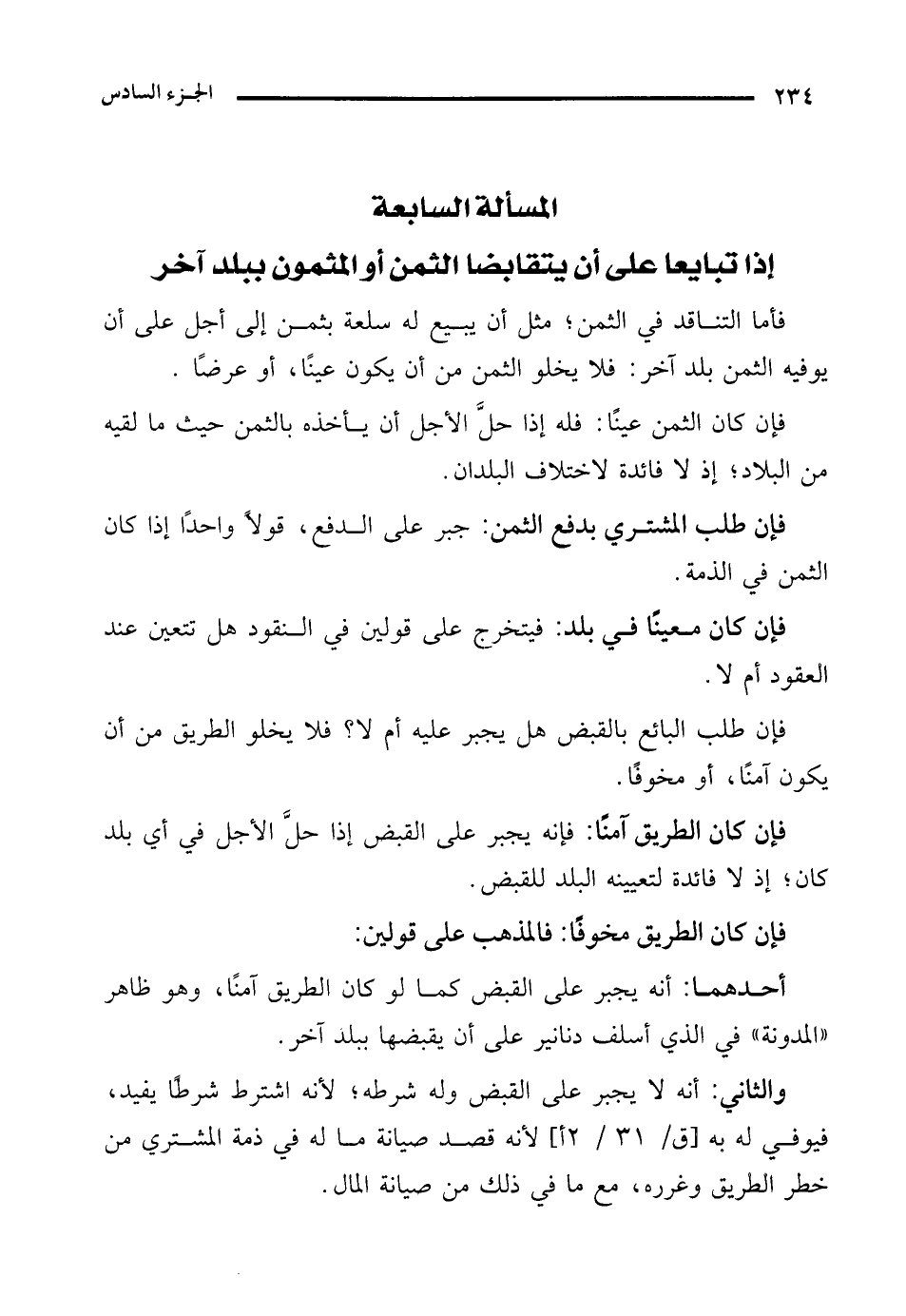 المسألة السابعة إذا تبايعا على أن يتقابضا الثمن أو المثمون ببلد آخر