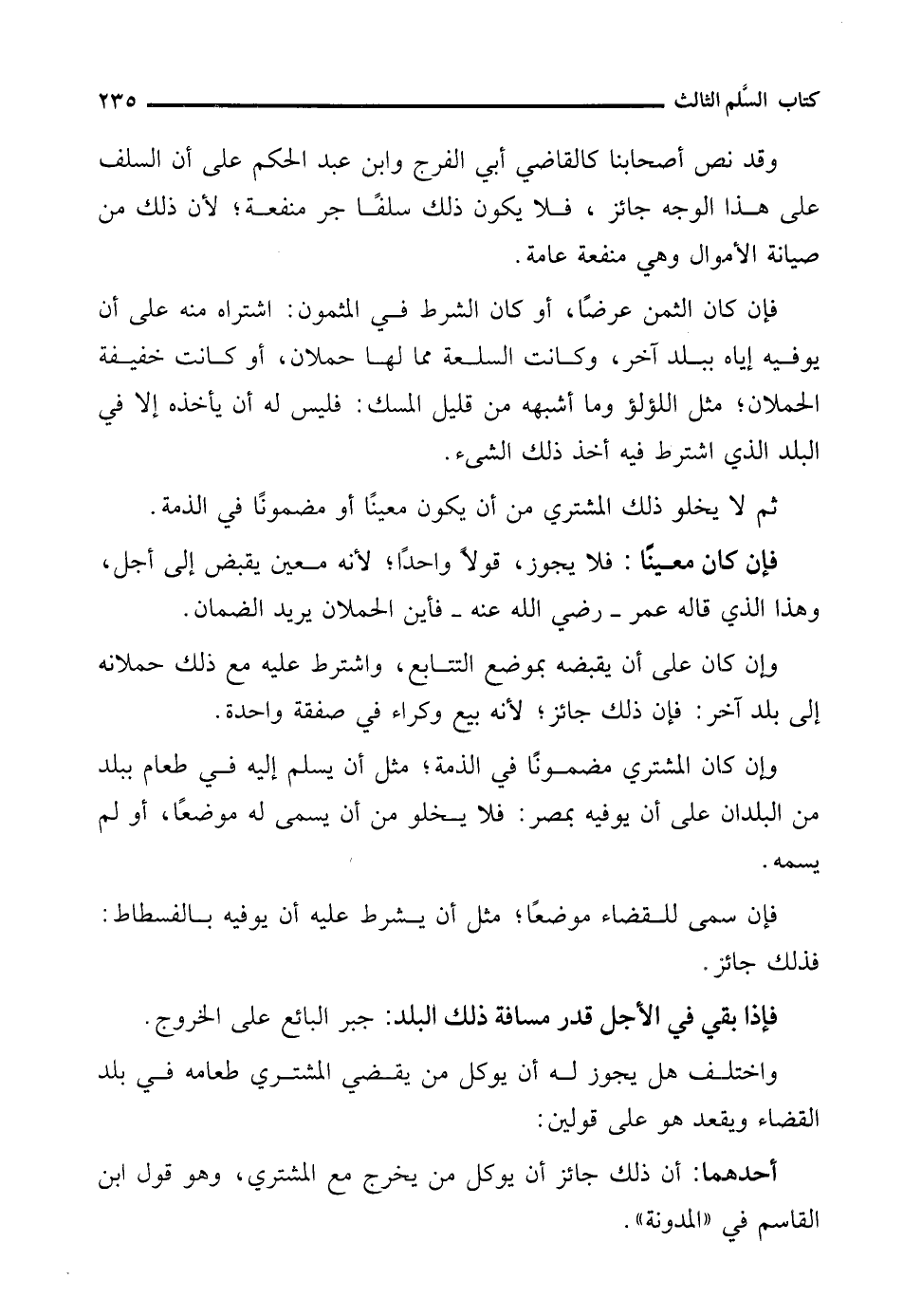 فإن كان الثمن عرضًا، أو كان الشرط في المثمون: اشتراه منه على أن يوفيه إياه ببلد آخر، وكانت السلعة مما لها حملان، أو كانت خفيفة الحملان؛ مثل اللؤلؤ وما أشبهه من قليل المسك: فليس له أن يأخذه إلا في البلد الذي اشترط فيه أخذ ذلك الشىء.