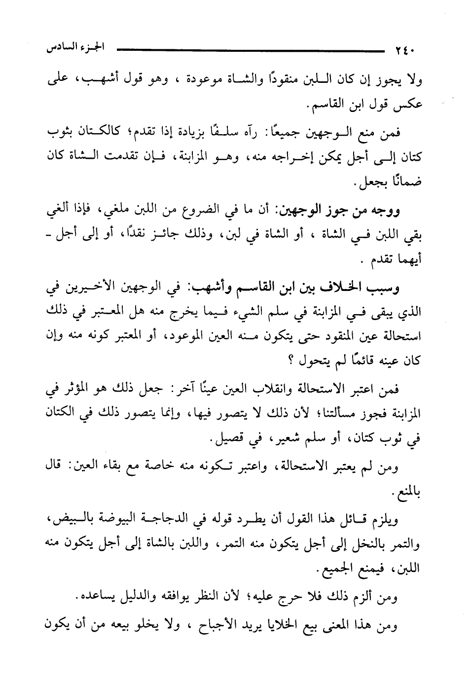 ويلزم قائل هذا القول أن يطرد قوله في الدجاجة البيوضة بالبيض، والتمر بالنخل إلى أجل يتكون منه التمر، واللبن بالشاة إلى أجل يتكون منه اللبن، فيمنع الجميع.