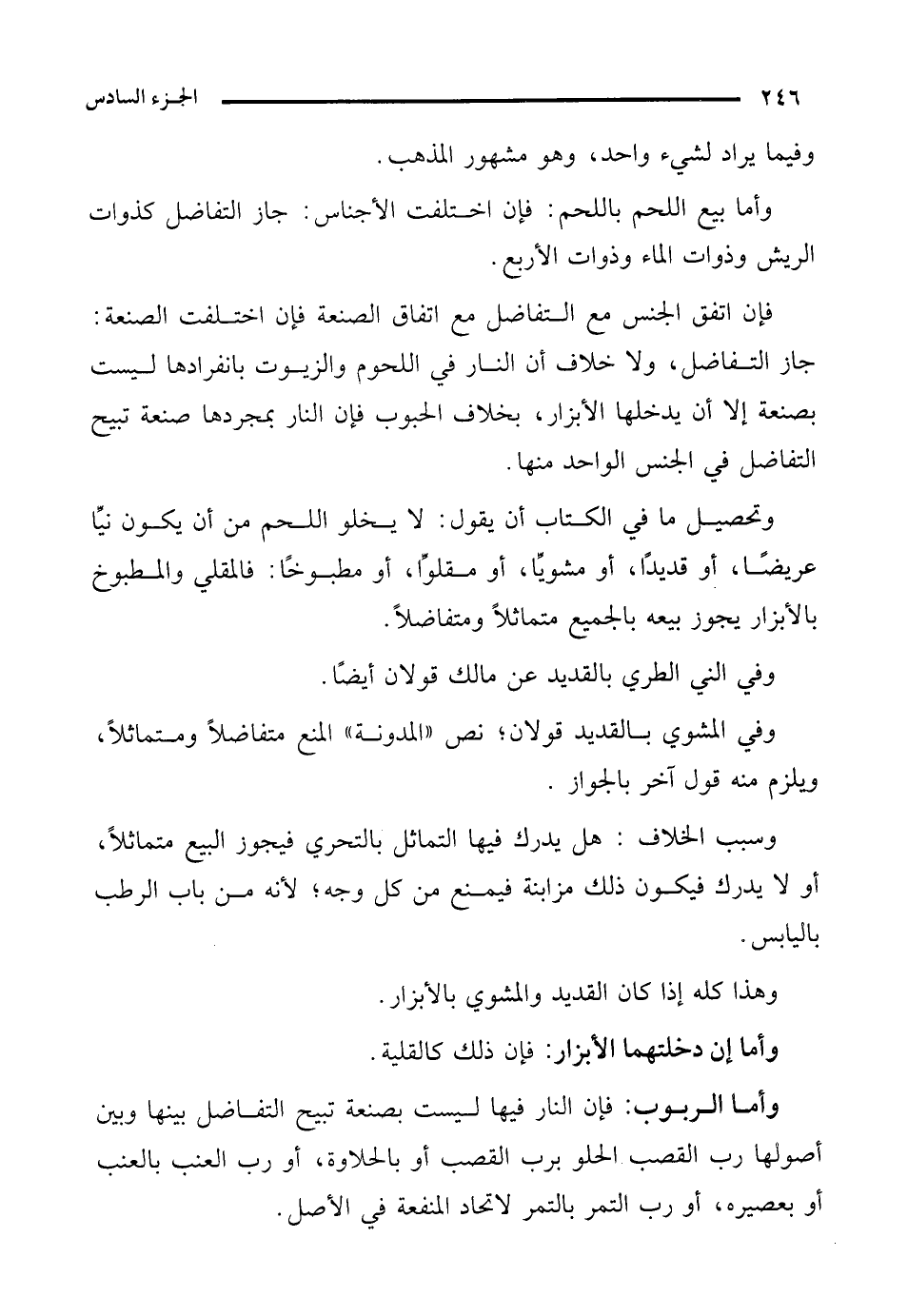 وتحصيل ما في الكتاب أن يقول: لا يخلو اللحم من أن يكون نيِّا عريضًا، أو قديدًا، أو مشويِّا، أو مقلوِّا، أو مطبوخًا: فالمقلي والمطبوخ بالأبزار يجوز بيعه بالجميع متماثلًا ومتفاضلًا.