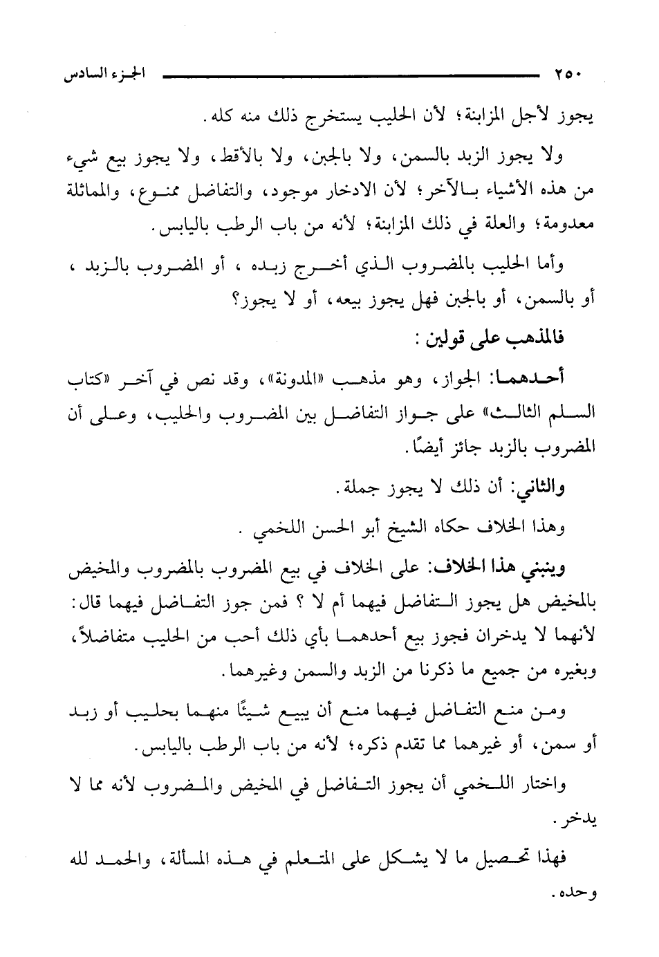 ومن منع التفاضل فيهما منع أن يبيع شيئًا منهما بحليب أو زبد أو سمن، أو غيرهما مما تقدم ذكره؛ لأنه من باب الرطب باليابس.