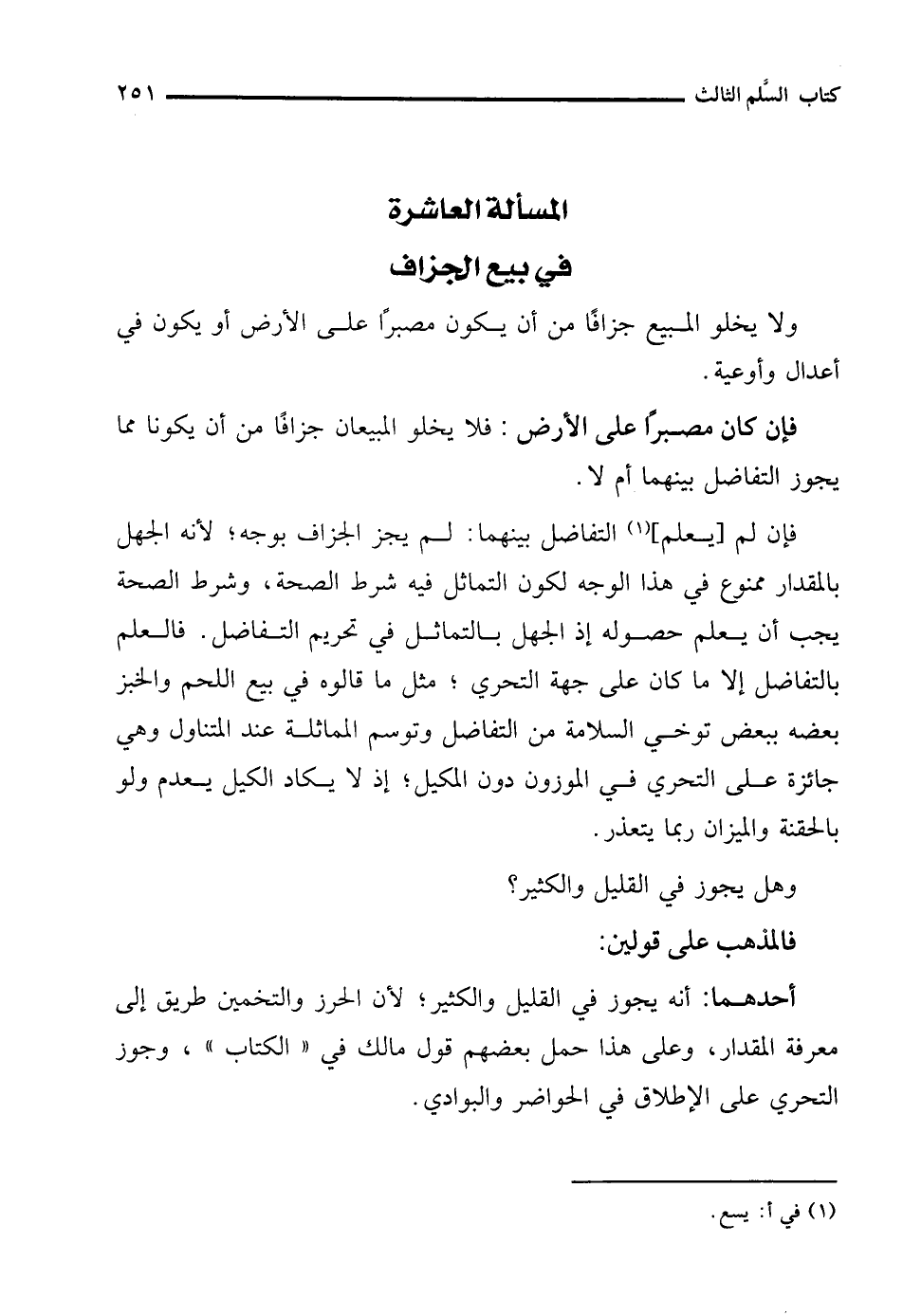 فإن لم [يعلم] (¬1) التفاضل بينهما: لم يجز الجزاف بوجه؛ لأنه الجهل بالمقدار ممنوع في هذا الوجه لكون التماثل فيه شرط الصحة، وشرط الصحة يجب أن يعلم حصوله إذ الجهل بالتماثل في تحريم التفاضل. فالعلم بالتفاضل إلا ما كان على جهة التحري؛ مثل ما قالوه في بيع اللحم والخبز بعضه ببعض توخي السلامة من التفاضل وتوسم المماثلة عند المتناول وهي جائزة على التحري في الموزون دون المكيل؛ إذ لا يكاد الكيل يعدم ولو بالحقنة والميزان ربما يتعذر.