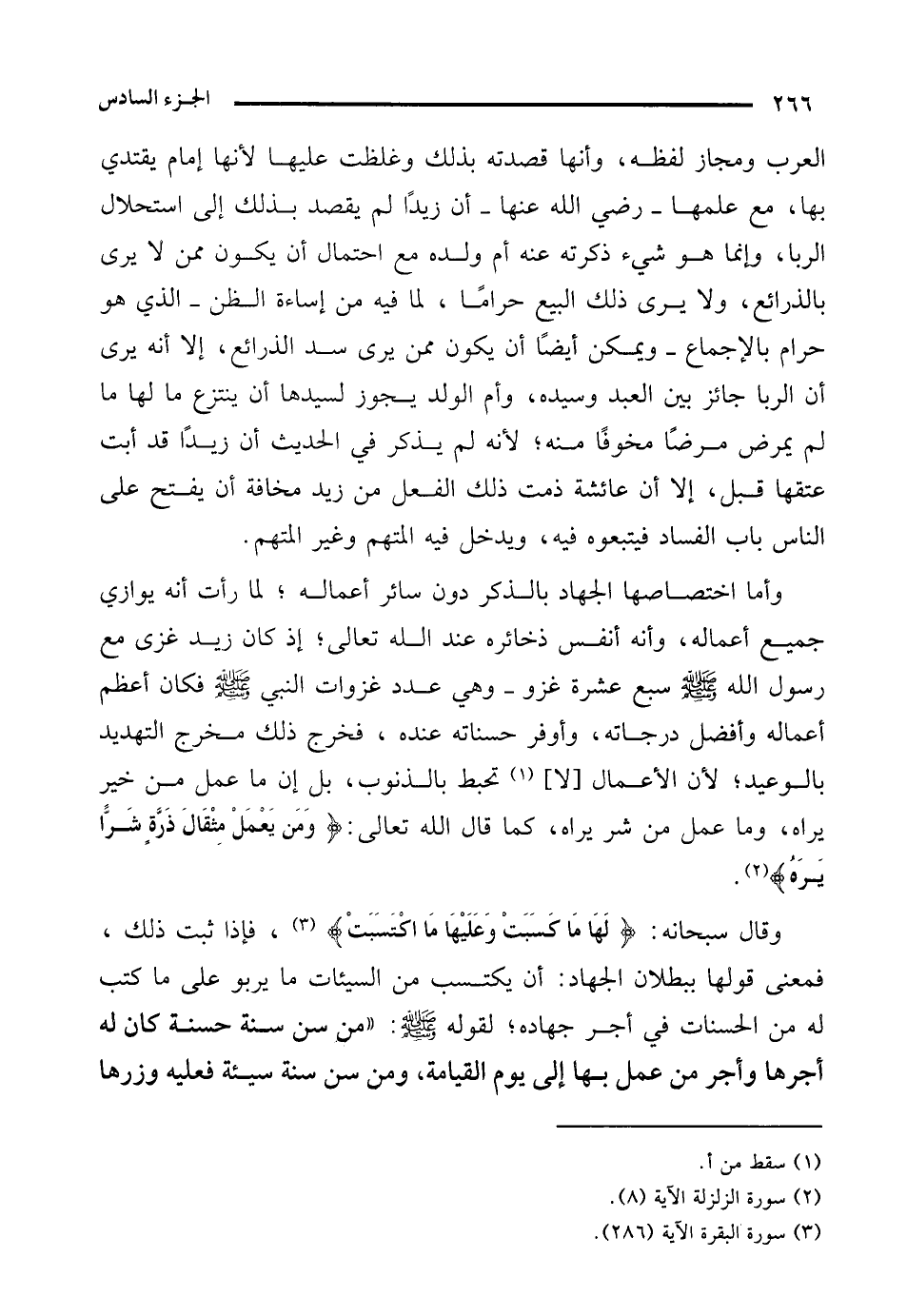 وقال سبحانه: {لَهَا مَا كسَبَتْ وَعَلَيْهَا مَا اكْتَسَبَتْ} (¬3)، فإذا ثبت ذلك، فمعنى قولها ببطلان الجهاد: أن يكتسب من السيئات ما يربو على ما كتب له من الحسنات في أجر جهاده؛ لقوله - صلى الله عليه وسلم -: "من سن سنة حسنة كان له أجرها وأجر من عمل بها إلى يوم القيامة، ومن سن سنة سيئة فعليه وزرها