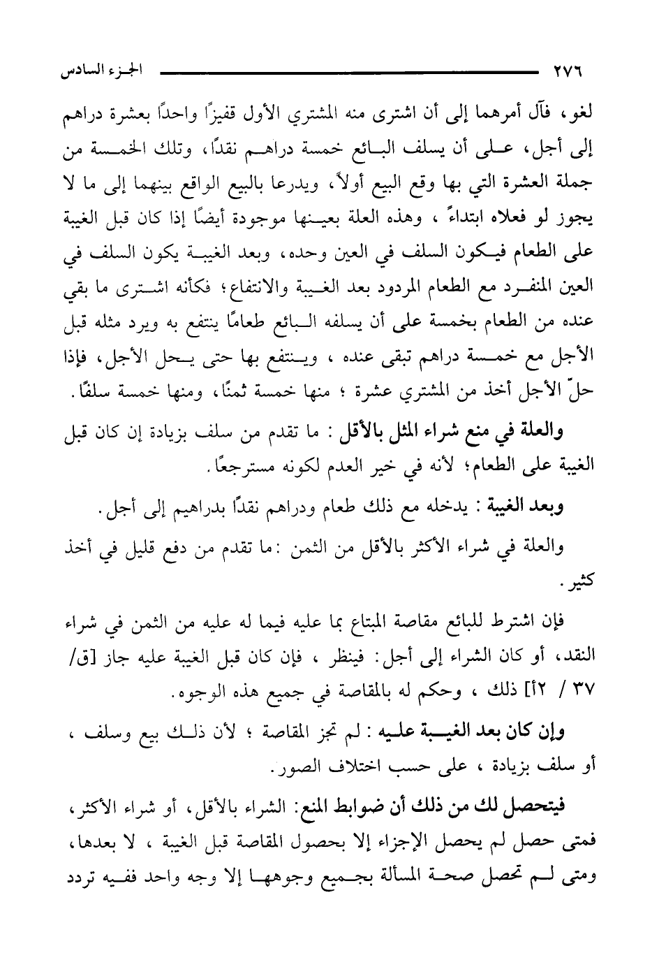 لغو، فآل أمرهما إلى أن اشترى منه المشتري الأول قفيزًا واحدًا بعشرة دراهم إلى أجل، على أن يسلف البائع خمسة دراهم نقدًا، وتلك الخمسة من جملة العشرة التي بها وقع البيع أولًا، ويدرعا بالبيع الواقع بينهما إلى ما لا يجوز لو فعلاه ابتداءً، وهذه العلة بعينها موجودة أيضًا إذا كان قبل الغيبة على الطعام فيكون السلف في العين وحده، وبعد الغيبة يكون السلف في العين المنفرد مع الطعام المردود بعد الغيبة والانتفاع؛ فكأنه اشترى ما بقي عنده من الطعام بخمسة على أن يسلفه البائع طعامًا ينتفع به ويرد مثله قبل الأجل مع خمسة دراهم تبقى عنده، وينتفع بها حتى يحل الأجل، فإذا حلّ الأجل أخذ من المشتري عشرة؛ منها خمسة ثمنًا، ومنها خمسة سلفًا.