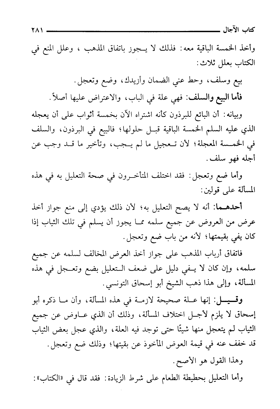 فاتفاق أرباب المذهب على جواز أخذ العرض المخالف لسلمه عن جميع سلمه، وإن كان لا يفي دليل على ضعف التعليل، بضع وتعجل في هذه المسألة، وإلى هذا ذهب الشيخ أبو إسحاق التونسي.