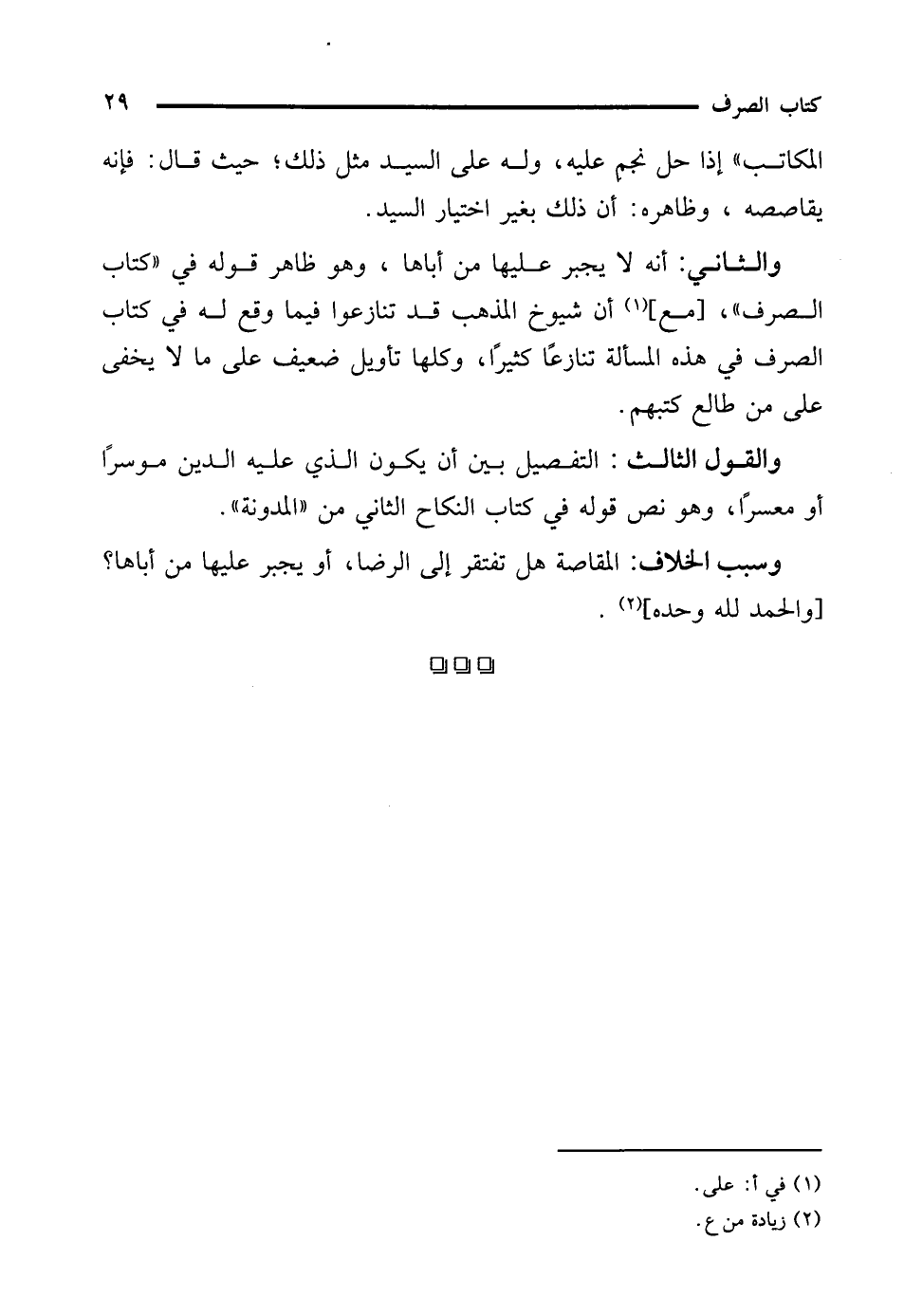 والثاني: أنه لا يجبر عليها من أباها، وهو ظاهر قوله في "كتاب الصرف"، [مع] (¬1) أن شيوخ المذهب قد تنازعوا فيما وقع له في كتاب الصرف في هذه المسألة تنازعًا كثيرًا، وكلها تأويل ضعيف على ما لا يخفى على من طالع كتبهم.