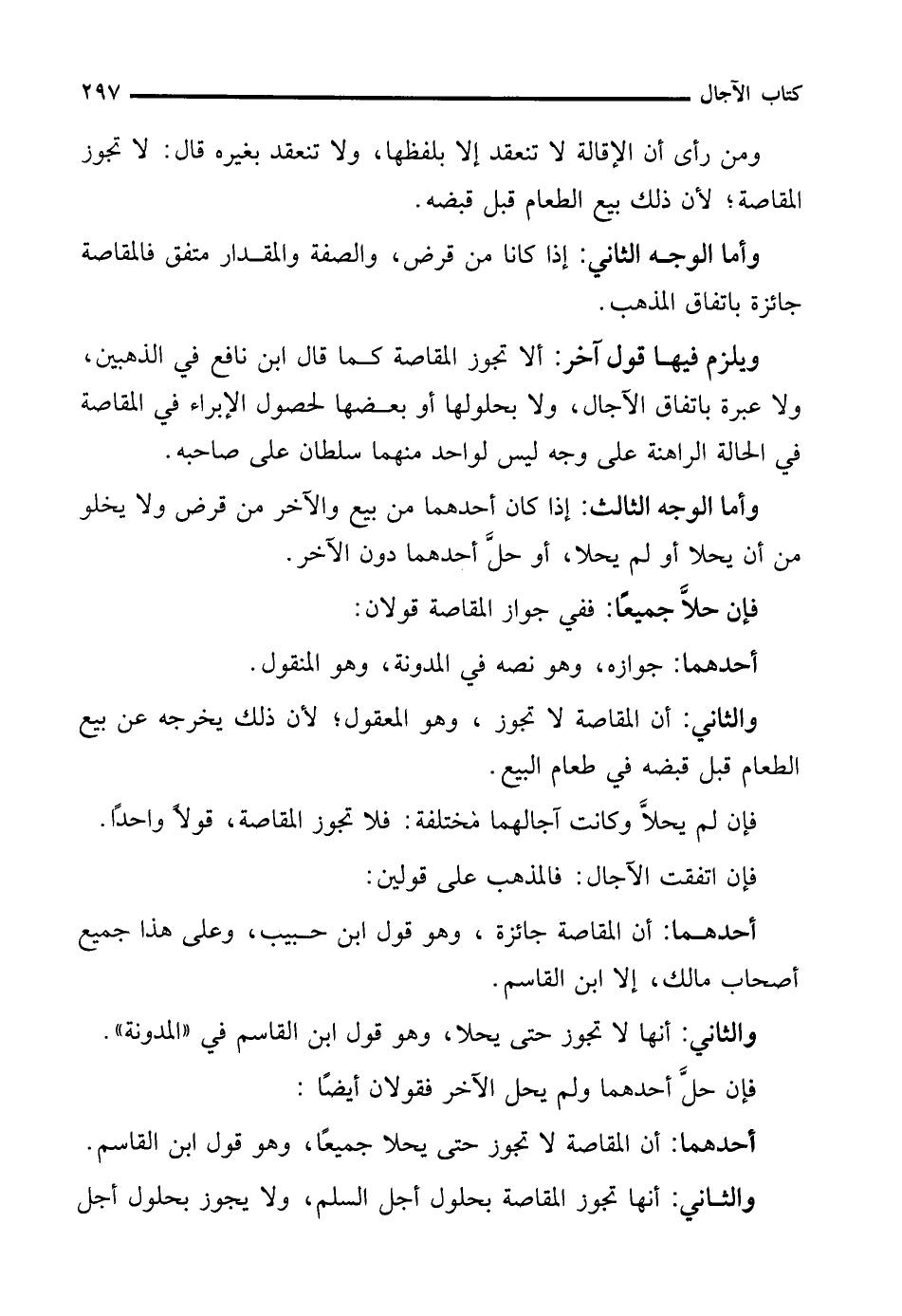 ويلزم فيها قول آخر: ألا تجوز المقاصة كما قال ابن نافع في المذهبين، ولا عبرة باتفاق الآجال، ولا بحلولها أو بعضها لحصول الإبراء في المقاصة في الحالة الراهنة على وجه ليس لواحد منهما سلطان على صاحبه.