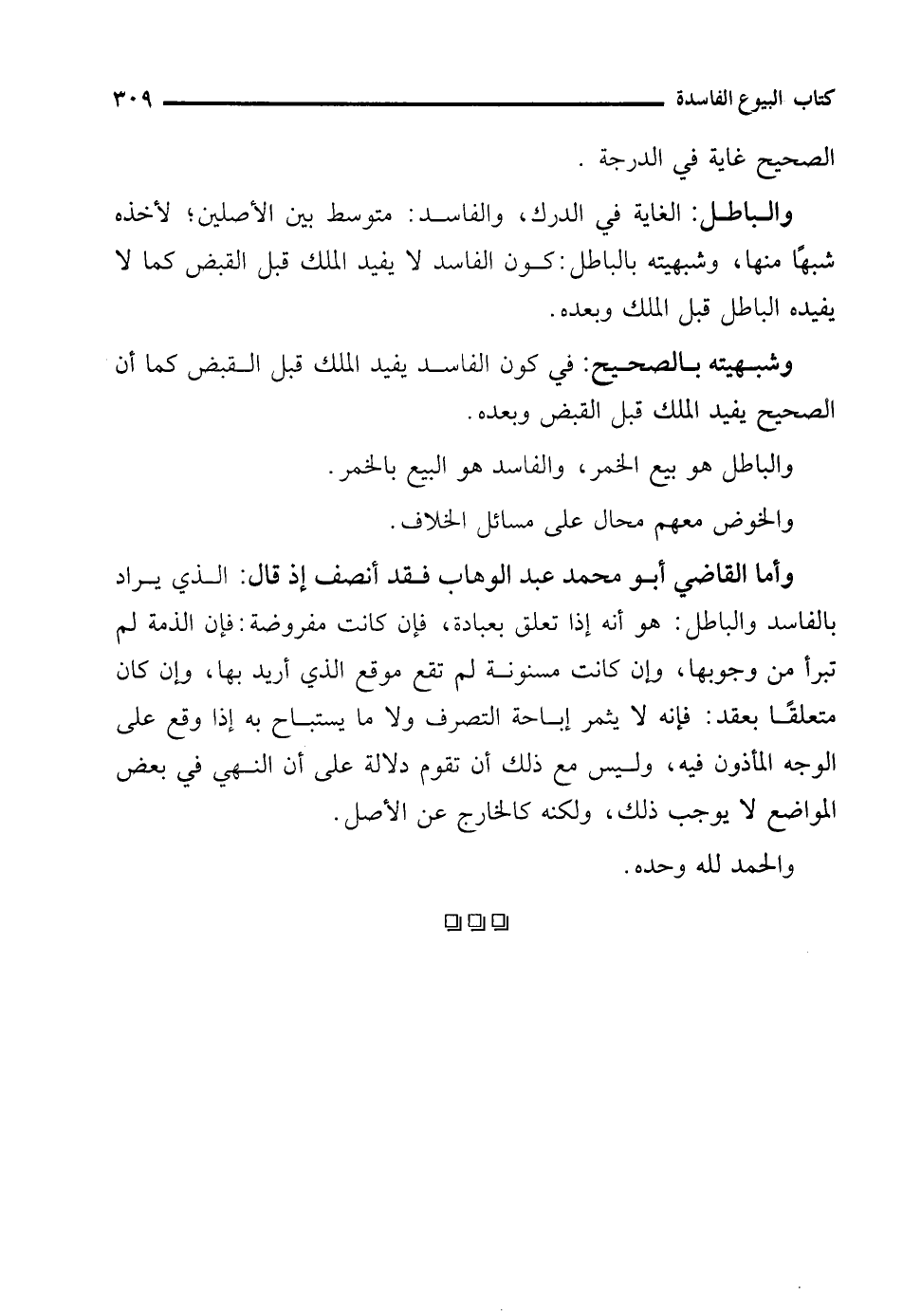 وأما القاضي أبو محمَّد عبد الوهاب فقد أنصف إذ قال: الذي يراد بالفاسد والباطل: هو أنه إذا تعلق بعبادة، فإن كانت مفروضة: فإن الذمة لم تبرأ من وجوبها، وإن كانت مسنونة لم تقع موقع الذي أريد بها، وإن كان متعلقًا بعقد: فإنه لا يثمر إباحة التصرف ولا ما يستباح به إذا وقع على الوجه المأذون فيه، وليس مع ذلك أن تقوم دلالة على أن النهي في بعض المواضع لا يوجب ذلك، ولكنه كالخارج عن الأصل.