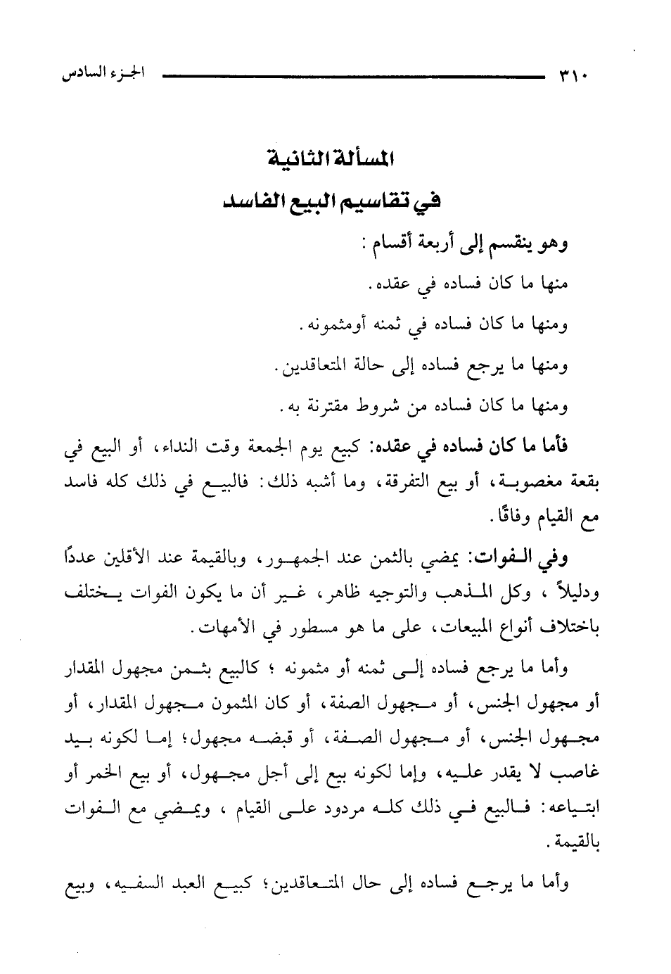 وفي الفوات: يمضي بالثمن عند الجمهور، وبالقيمة عند الأقلين عددًا ودليلًا، وكل المذهب والتوجيه ظاهر، غير أن ما يكون الفوات يختلف باختلاف أنواع المبيعات، على ما هو مسطور في الأمهات.