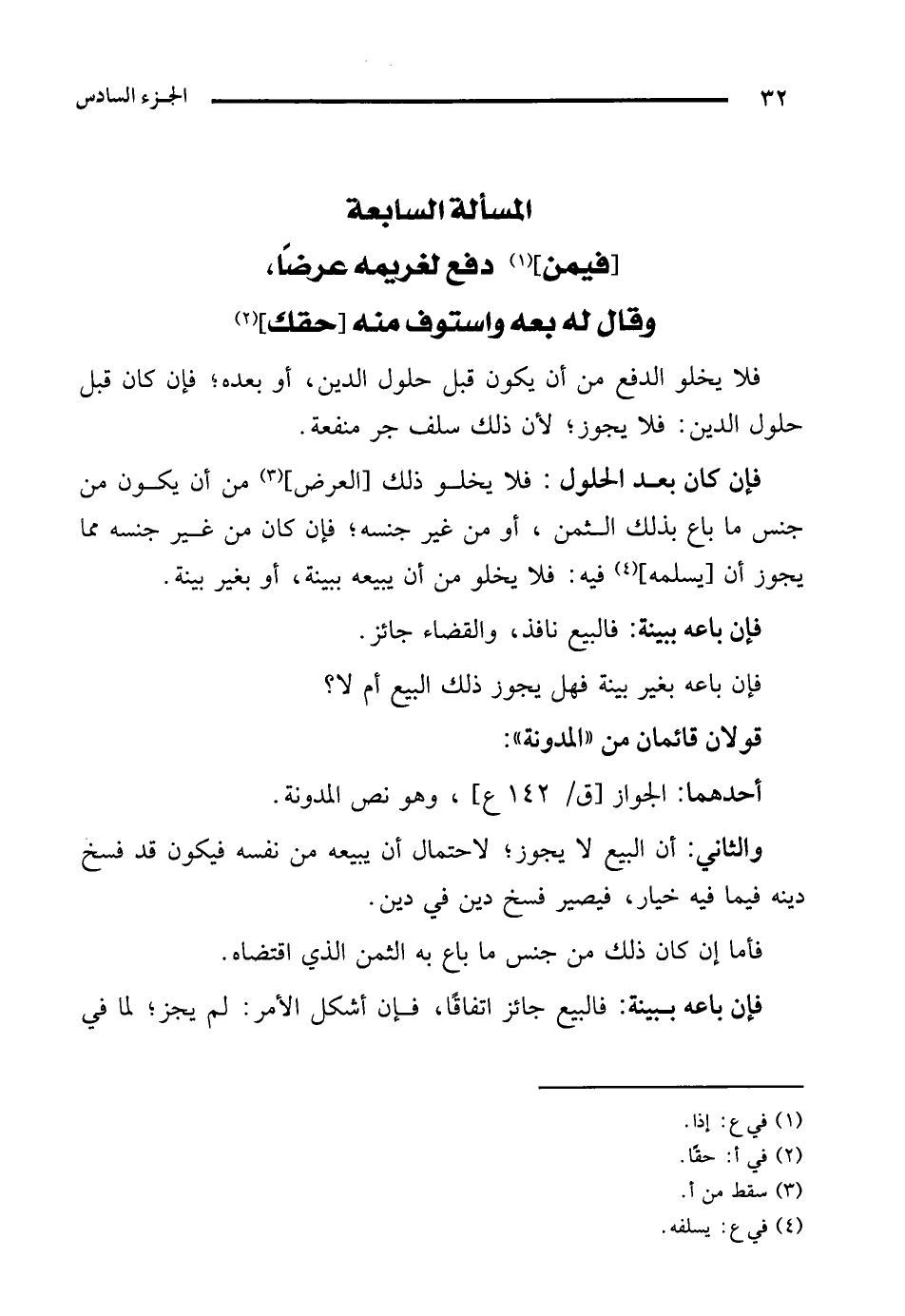 فإن كان بعد الحلول: فلا يخلو ذلك [العرض] (¬3) من أن يكون من جنس ما باع بذلك الثمن، أو من غير جنسه؛ فإن كان من غير جنسه مما يجوز أن [يسلمه] (¬4) فيه: فلا يخلو من أن يبيعه ببينة، أو بغير بينة.