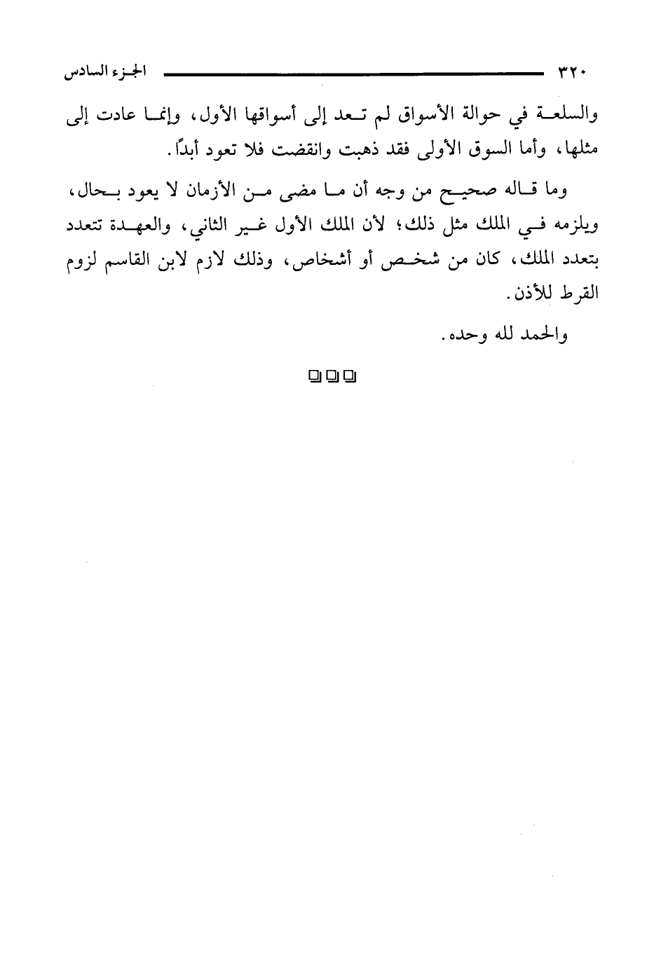 والسلعة في حوالة الأسواق لم تعد إلى أسواقها الأول، وإنما عادت إلى مثلها، وأما السوق الأولى فقد ذهبت وانقضت فلا تعود أبدًا.