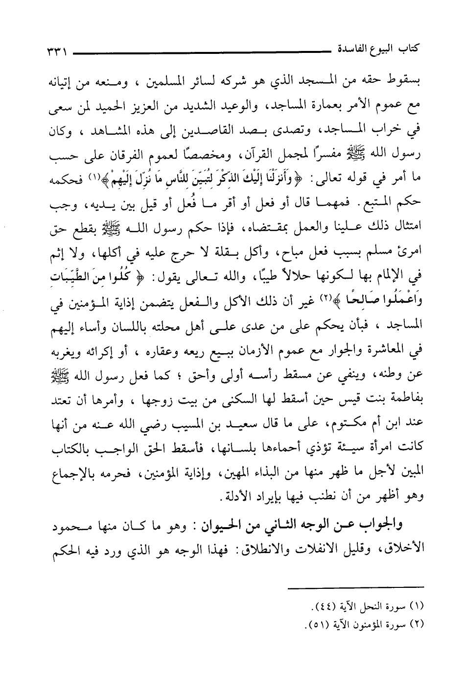 بسقوط حقه من المسجد الذي هو شركه لسائر المسلمين، ومنعه من إتيانه مع عموم الأمر بعمارة المساجد، والوعيد الشديد من العزيز الحميد لمن سعى في خراب المساجد، وتصدى بصد القاصدين إلى هذه المشاهد، وكان رسول الله - صلى الله عليه وسلم - مفسرًا لمجمل القرآن، ومخصصًا لعموم الفرقان على حسب ما أمر في قوله تعالى: {وَأَنْزَلْنَا إِلَيْكَ الذِّكْرَ لِتُبَيِّنَ لِلنَّاسِ مَا نُزِّلَ إِلَيْهِمْ} (¬1) فحكمه حكم المتبع. فمهما قال أو فعل أو أقر ما فُعل أو قيل بين يديه، وجب امتثال ذلك علينا والعمل بمقتضاه، فإذا حكم رسول الله - صلى الله عليه وسلم - بقطع حق امرئ مسلم بسبب فعل مباح، وأكل بقلة لا حرج عليه في أكلها, ولا إثم في الإلمام بها لكونها حلالًا طيبًا، والله تعالى يقول: {كُلُوا مِنَ الطَّيِّبَاتِ وَاعْمَلُوا صَالِحًا} (¬2) غير أن ذلك الأكل والفعل يتضمن إذاية المؤمنين في المساجد، فبأن يحكم على من عدى على أهل محلته باللسان وأساء إليهم في المعاشرة والجوار مع عموم الأزمان ببيع ريعه وعقاره، أو إكرائه ويغربه عن وطنه، وينفي عن مسقط رأسه أولى وأحق؛ كما فعل رسول الله - صلى الله عليه وسلم - بفاطمة بنت قيس حين أسقط لها السكنى من بيت زوجها، وأمرها أن تعتد عند ابن أم مكتوم، على ما قال سعيد بن المسيب رضي الله عنه من أنها كانت امرأة سيئة تؤذي أحماءها بلسانها، فأسقط الحق الواجب بالكتاب المبين لأجل ما ظهر منها من البذاء المهين، وإذاية المؤمنين، فحرمه بالإجماع وهو أظهر من أن نطنب فيها بإيراد الأدلة.