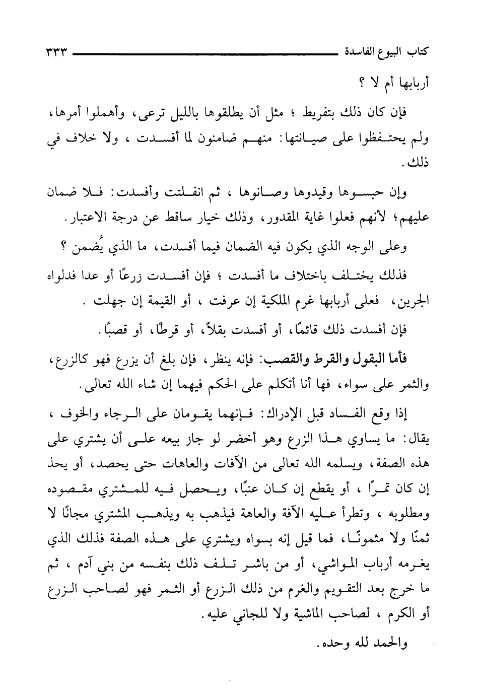 إذا وقع الفساد قبل الإدراك: فإنهما يقومان على الرَّجاء والخوف، يقال: ما يساوي هذا الزرع وهو أخضر لو جاز بيعه على أن يشتري على هذه الصفة، ويسلمه الله تعالى من الآفات والعاهات حتى يحصد، أو يحذ إن كان تمرًا، أو يقطع إن كان عنبًا، ويحصل فيه للمشتري مقصوده ومطلوبه، وتطرأ عليه الآفة والعاهة فيذهب به ويذهب المشتري مجانًا لا ثمنًا ولا مثمونًا، فما قيل إنه بسواه ويشتري على هذه الصفة فذلك الذي يغرمه أرباب المواشي، أو من باشر تلف ذلك بنفسه من بني آدم، ثم ما خرج بعد التقويم والغرم من ذلك الزرع أو الثمر فهو لصاحب الزرع أو الكرم، لصاحب الماشية ولا للجاني عليه.