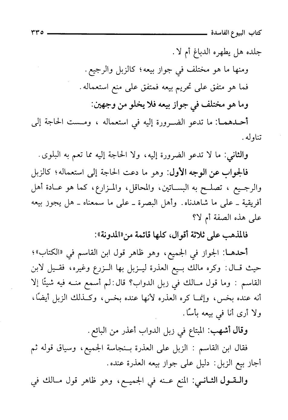 فالجواب عن الوجه الأول: وهو ما دعت الحاجة إلى استعماله؛ كالزبل والرجيع، تصلح به البساتين، والمحاقل، والمزارع، كما هو عادة أهل أفريقية -على ما شاهدناه. وأهل البصرة -على ما سمعناه- هل يجوز بيعه على هذه الصفة أم لا؟