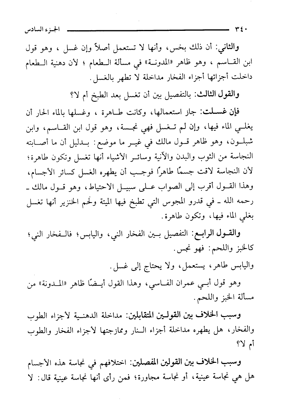 والثاني: أن ذلك بخس، وأنها لا تستعمل أصلًا وإن غسل، وهو قول ابن القاسم، وهو ظاهر "المدونة" في مسألة الطعام؛ لأن دهنية الطعام داخلت أجزائها أجزاء الفخار مداخلة لا تطهر بالغسل.