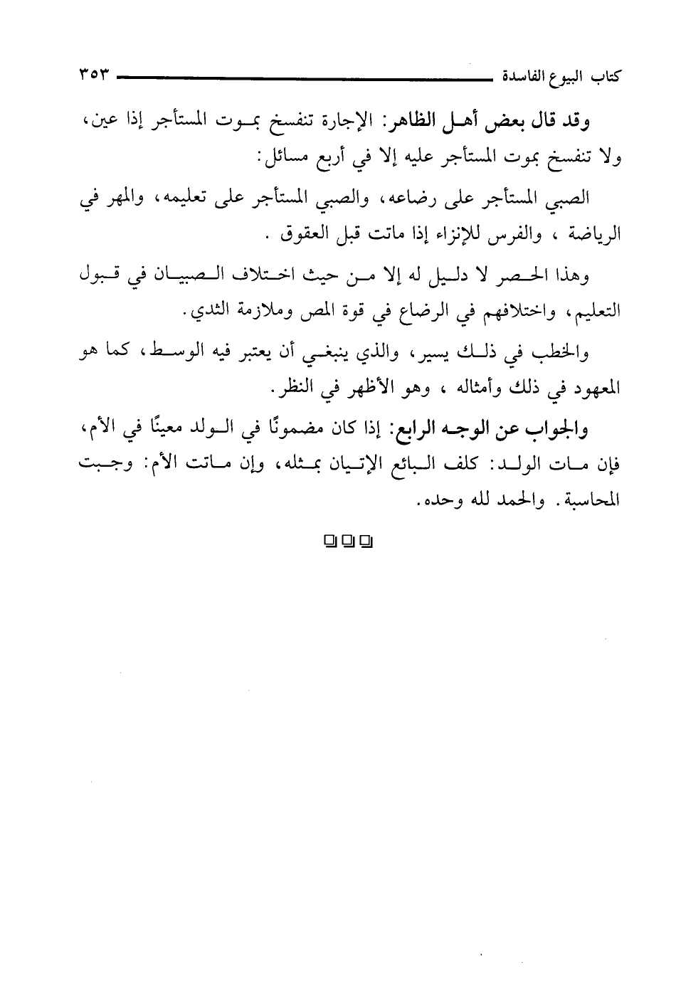 والجواب عن الوجه الرابع: إذا كان مضمونًا في الولد معينًا في الأم، فإن مات الولد: كلف البائع الإتيان بمثله، وإن ماتت الأم: وجبت المحاسبة. والحمد لله وحده.