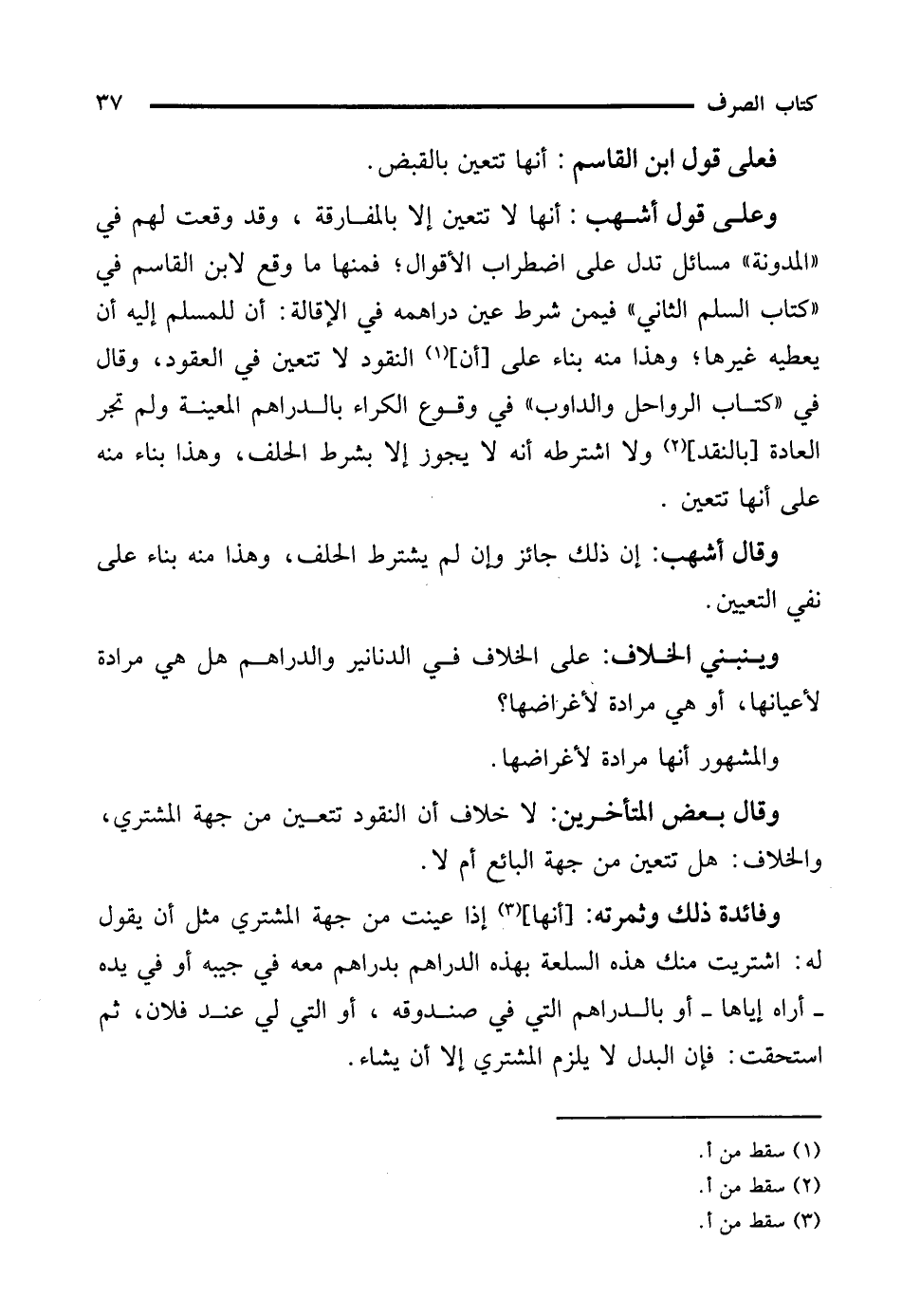 وعلى قول أشهب: أنها لا تتعين إلا بالمفارقة، وقد وقعت لهم في "المدونة" مسائل تدل على اضطراب الأقوال؛ فمنها ما وقع لابن القاسم في "كتاب السلم الثاني" فيمن شرط عين دراهمه في الإقالة: أن للمسلم إليه أن يعطيه غيرها؛ وهذا منه بناء على [أن] (¬1) النقود لا تتعين في العقود، وقال في "كتاب الرواحل والدواب" في وقوع الكراء بالدراهم المعينة ولم تجر العادة [بالنقد] (¬2) ولا اشترطه أنه لا يجوز إلا بشرط الحلف، وهذا بناء منه على أنها تتعين.