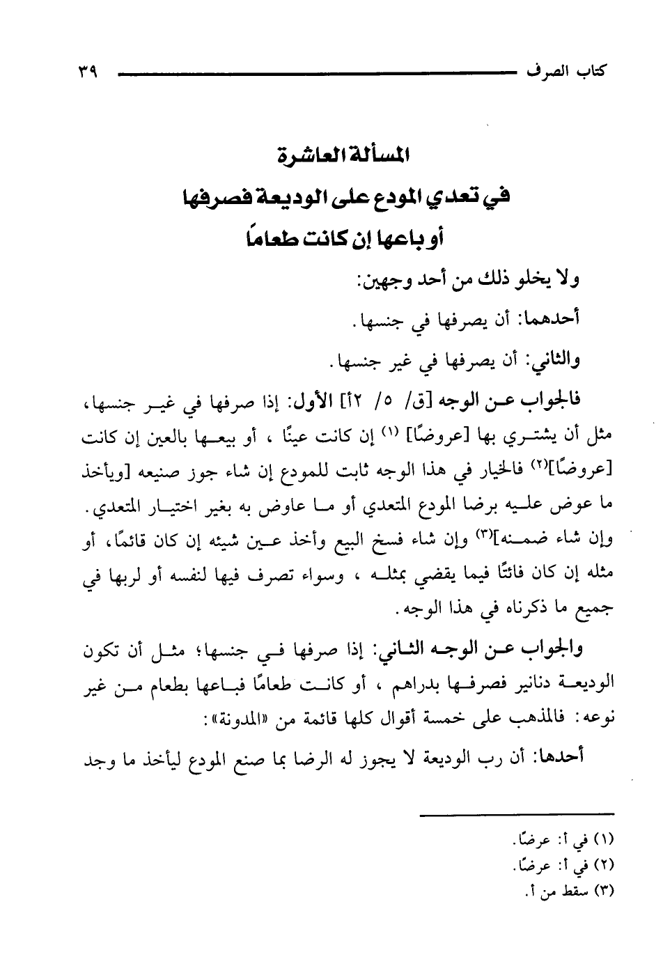 والجواب عن الوجه الثاني: إذا صرفها في جنسها؛ مثل أن تكون الوديعة دنانير فصرفها بدراهم، أو كانت طعامًا فباعها بطعام من غير نوعه: فالمذهب على خمسة أقوال كلها قائمة من "المدونة":