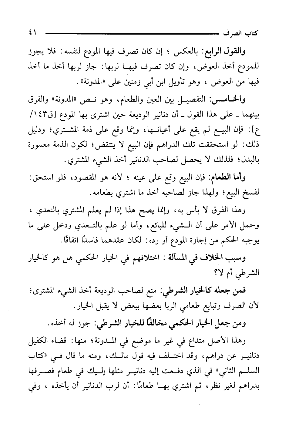 والخامس: التفصيل بين العين والطعام، وهو نص "المدونة" والفرق بينهما -على هذا القول- أن دنانير الوديعة حين اشترى بها المودع: فإن البيع لم يقع على أعيانها، وإنما وقع على ذمة المشترى؛ ودليل ذلك: لو استحققت تلك الدراهم فإن البيع لا ينتقض؛ لكون الذمة معمورة بالبدل؛ فلذلك لا يحصل لصاحب الدنانير أخذ الشيء المشتري.