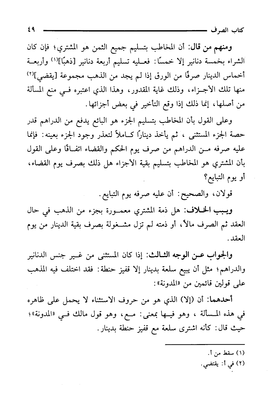 ومنهم من قال: أن المخاطب بتسليم جميع الثمن هو المشتري؛ فإن كان الشراء بخمسة دنانير إلا خمسًا: فعليه تسليم أربعة دنانير [ذهبًا] (¬1) وأربعة أخماس الدينار صرفًا من الورق إذا لم يجد من الذهب مجموعة [يقضي] (¬2) منها تلك الأجزاء، وذلك غاية المقدور، وهذا الذي اعتبره في منع المسألة من أصلها، إنما ذلك إذا وقع التأخير في بعض أجزائها.