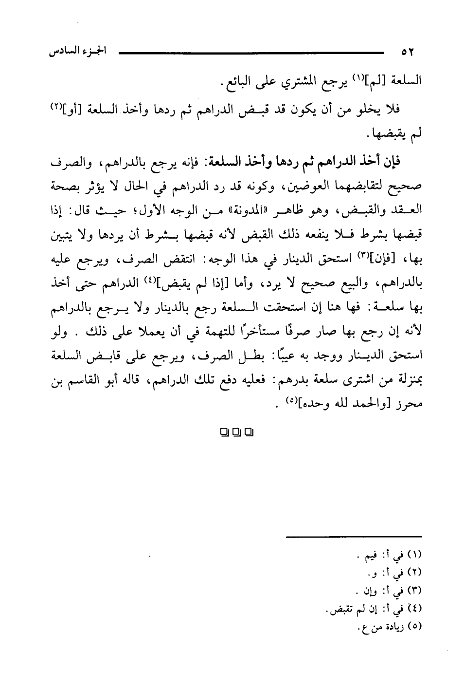 فإن أخذ الدراهم ثم ردها وأخذ السلعة: فإنه يرجع بالدراهم، والصرف صحيح لتقابضهما العوضين، وكونه قد رد الدراهم في الحال لا يؤثر بصحة العقد والقبض، وهو ظاهر "المدونة" من الوجه الأول؛ حيث قال: إذا قبضها بشرط فلا ينفعه ذلك القبض لأنه قبضها بشرط أن يردها ولا يتبين بها، [فإن] (¬3) استحق الدينار في هذا الوجه: انتقض الصرف، ويرجع عليه بالدراهم، والبيع صحيح لا يرد، وأما [إذا لم يقبض] (¬4) الدراهم حتى أخذ بها سلعة: فهاهنا إن استحقت السلعة رجع بالدينار ولا يرجع بالدراهم لأنه إن رجع بها صار صرفًا مستأخرًا للتهمة في أن يعملا على ذلك. ولو استحق الدينار ووجد به عيبًا: بطل الصرف، ويرجع على قابض السلعة بمنزلة من اشترى سلعة بدرهم: فعليه دفع تلك الدراهم، قاله أبو القاسم بن محرز [والحمد لله وحده] (¬5).