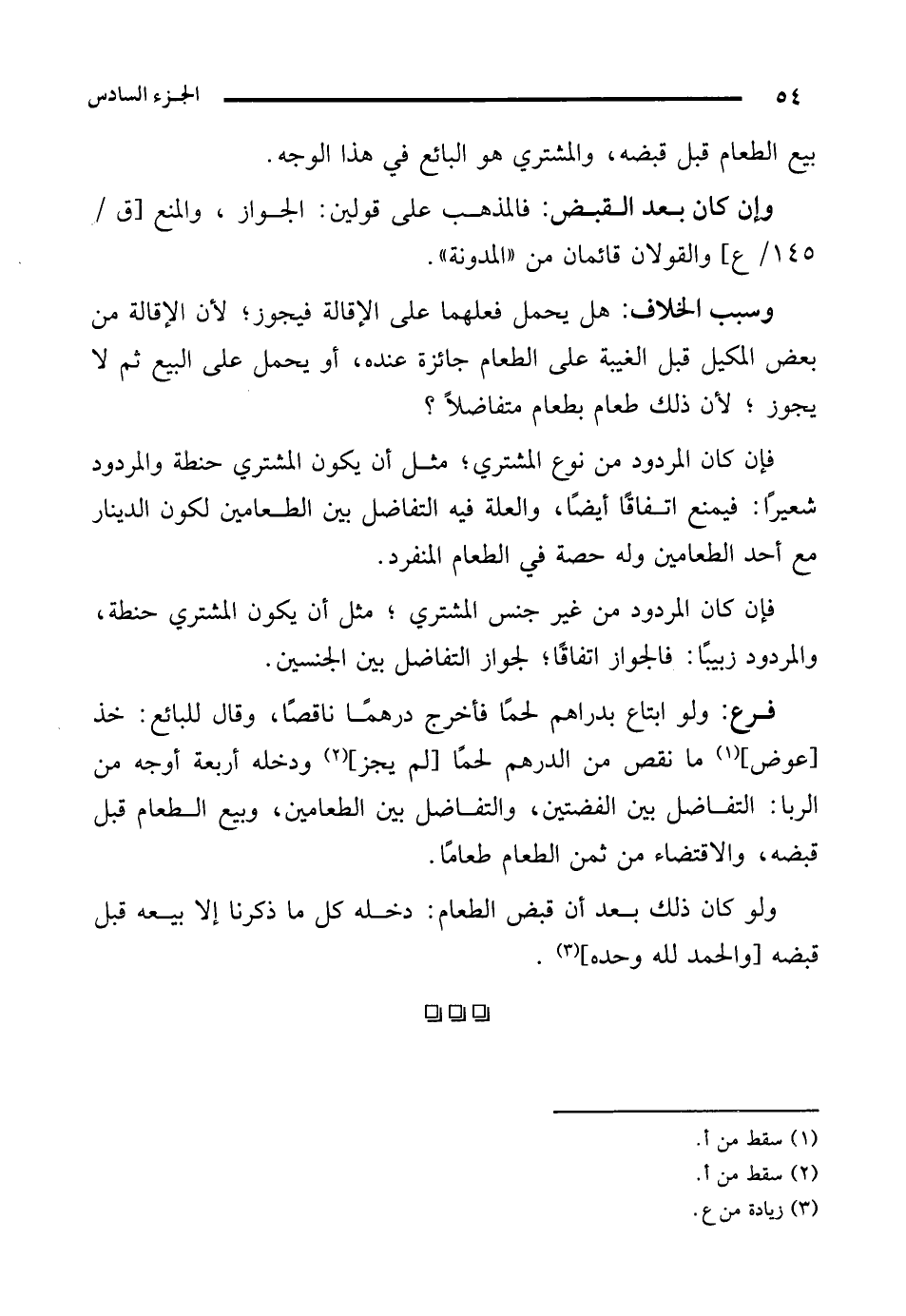 فإن كان المردود من غير جنس المشتري؛ مثل أن يكون المشتري حنطة، والمردود زبيبًا: فالجواز اتفاقًا؛ لجواز التفاضل بين الجنسين.