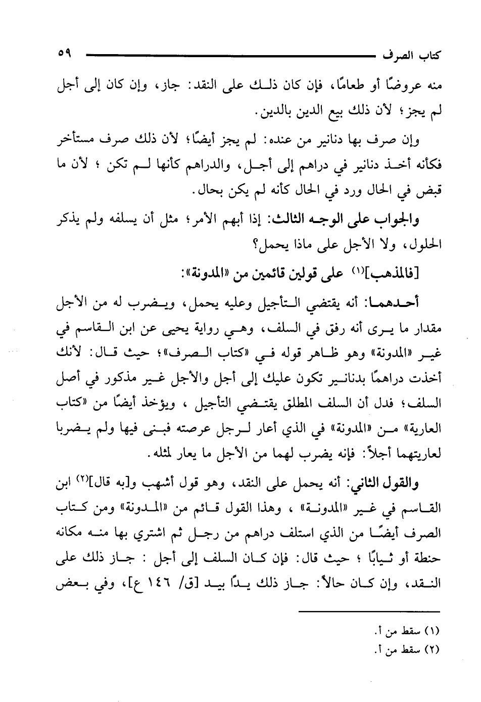 أحدهما: أنه يقتضي التأجيل وعليه يحمل، ويضرب له من الأجل مقدار ما يرى أنه رفق في السلف، وهي رواية يحيى عن ابن القاسم في غير "المدونة" وهو ظاهر قوله في "كتاب الصرف"؛ حيث قال: لأنك أخذت دراهمًا بدنانير تكون عليك إلى أجل والأجل غير مذكور في أصل السلف؛ فدل أن السلف المطلق يقتضي التأجيل، ويؤخذ أيضًا من "كتاب العارية" من "المدونة" في الذي أعار لرجل عرصته فبنى فيها ولم يضربا لعاريتهما أجلًا: فإنه يضرب لهما من الأجل ما يعار لمثله.