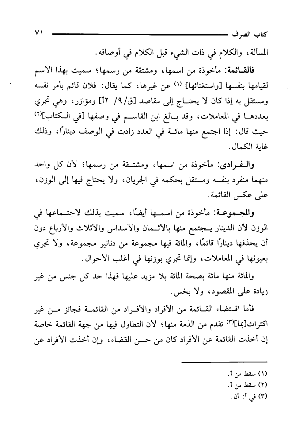 فالقائمة: مأخوذة من اسمها، ومشتقة من رسمها؛ سميت بهذا الاسم لقيامها بنفسها [واستغنائها] (¬1) عن غيرها، كما يقال: فلان قائم بأمر نفسه ومستقل به إذا كان لا يحتاج إلى مقاصد ومؤازر، وهي تجري بعددها في المعاملات، وقد بالغ ابن القاسم في وصفها [في الكتاب] (¬2) حيث قال: إذا اجتمع منها مائة في العدد زادت في الوصف دينارًا، وذلك غاية الكمال.