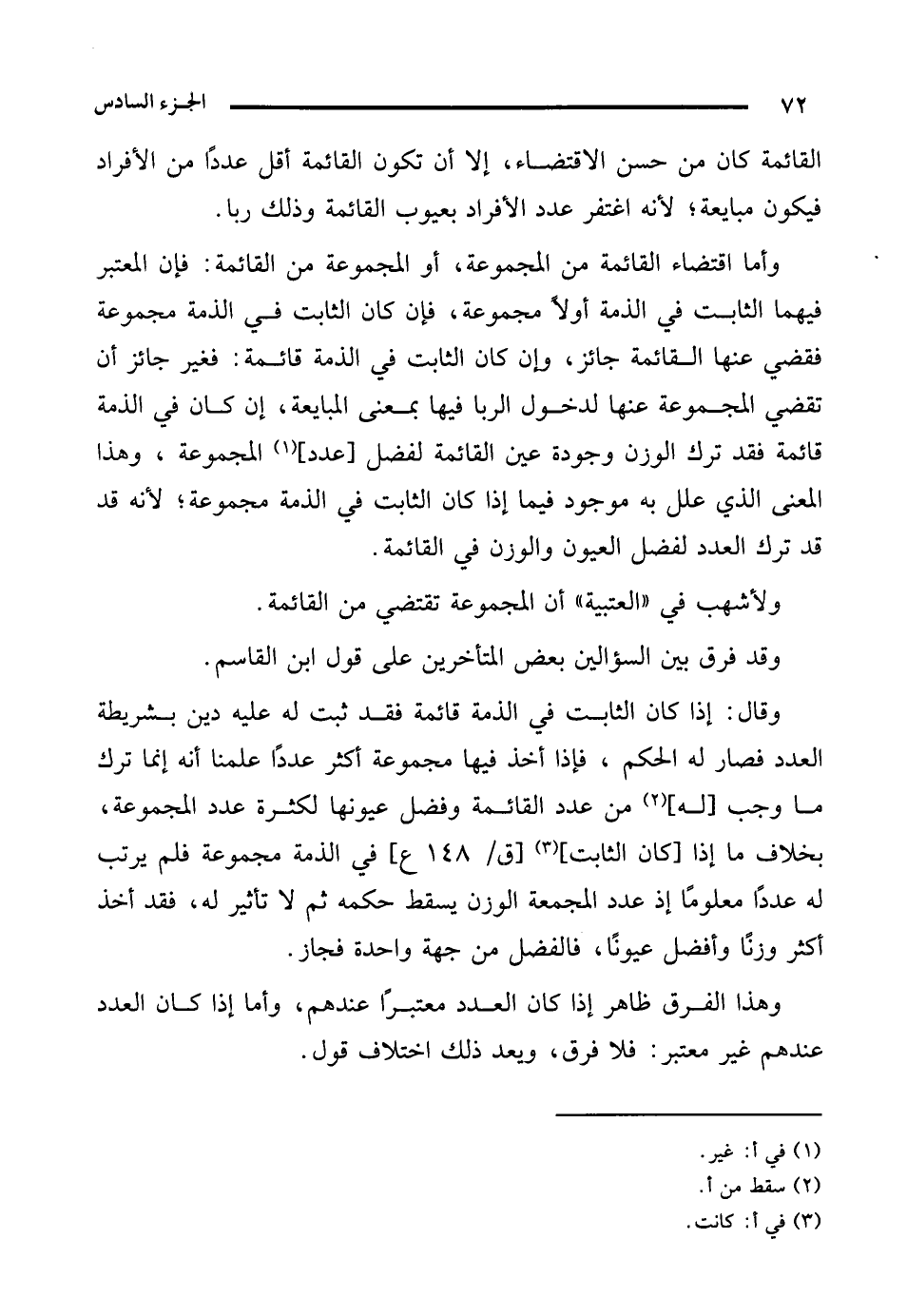 وأما اقتضاء القائمة من المجموعة، أو المجموعة من القائمة: فإن المعتبر فيهما الثابت في الذمة أولًا مجموعة، فإن كان الثابت في الذمة مجموعة فقضي عنها القائمة جائز، وإن كان الثابت في الذمة قائمة: فغير جائز أن تقضي المجموعة عنها لدخول الربا فيها بمعنى المبايعة، إن كان في الذمة قائمة فقد ترك الوزن وجودة عين القائمة لفضل [عدد] (¬1) المجموعة، وهذا المعنى الذي علل به موجود فيما إذا كان الثابت في الذمة مجموعة؛ لأنه قد قد ترك العدد لفضل العيون والوزن في القائمة.