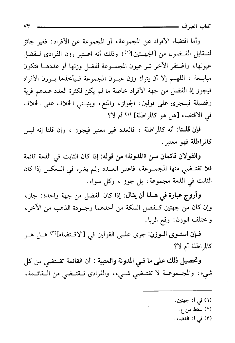 وأما اقتضاء الأفراد عن المجموعة، أو المجموعة عن الأفراد: فغير جائز لتقابل الفضول من [الجهتين] (¬1)؛ وذلك أنه اعتبر وزن الفرادى لفضل عيونها، واغتفر الآخر شر عيون المجموعة لفضل وزنها أو عددها فتكون مبايعة، اللهم إلا أن يترك وزن عيون المجموعة فيأخذها بوزن الأفراد فيجوز إذ الفضل من جهة الأفراد خاصة ما لم يكن لكثرة العدد عندهم فرية وفضيلة فيجرى على قولين: الجواز، والمنع، وينبني الخلاف على الخلاف في الاقتضاء [هل هو كالمراطلة] (¬2) أم لا؟
