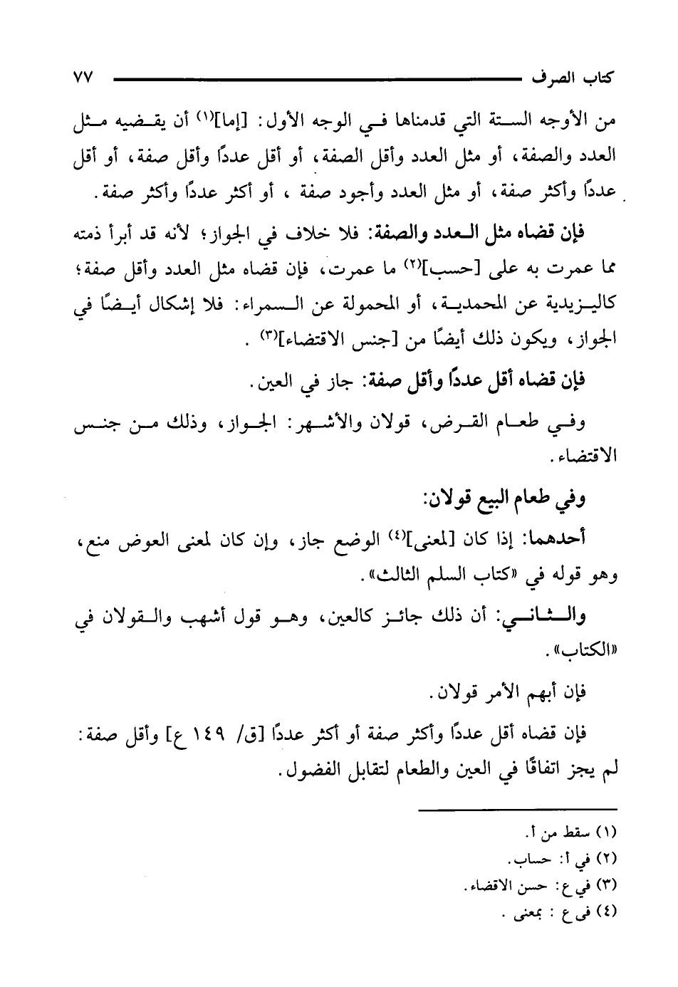 فإن قضاه مثل العدد والصفة: فلا خلاف في الجواز؛ لأنه قد أبرأ ذمته مما عمرت به على [حسب] (¬2) ما عمرت، فإن قضاه مثل العدد وأقل صفة؛ كاليزيدية عن المحمدية، أو المحمولة عن السمراء: فلا إشكال أيضًا في الجواز، ويكون ذلك أيضًا من [جنس الاقتضاء] (¬3).