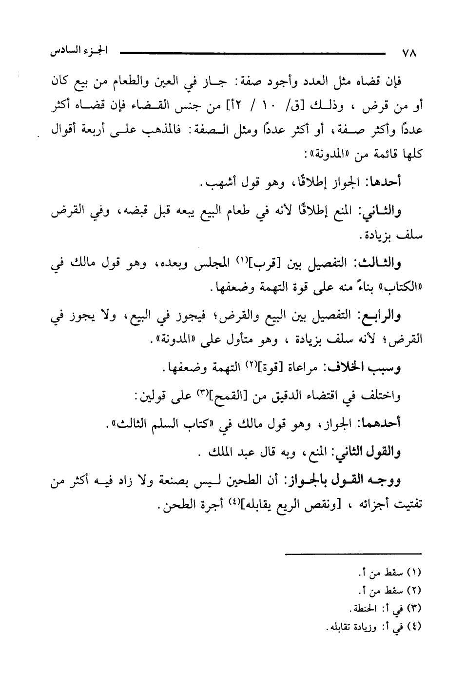 فإن قضاه مثل العدد وأجود صفة: جاز في العين والطعام من بيع كان أو من قرض، وذلك من جنس القضاء فإن قضاه أكثر عددًا وأكثر صفة، أو أكثر عددًا ومثل الصفة: فالمذهب على أربعة أقوال كلها قائمة من "المدونة":