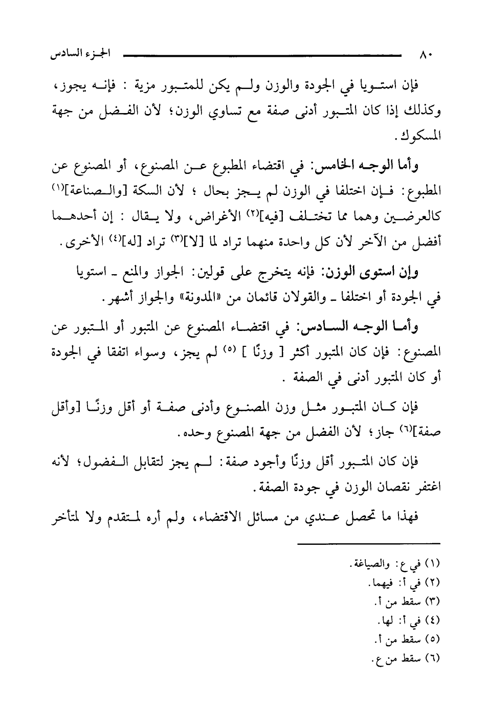 وأما الوجه السادس: في اقتضاء المصنوع عن المتبور أو المتبور عن المصنوع: فإن كان المتبور أكثر [وزنًا] (¬5) لم يجز، وسواء اتفقا في الجودة أو كان المتبور أدنى في الصفة.
