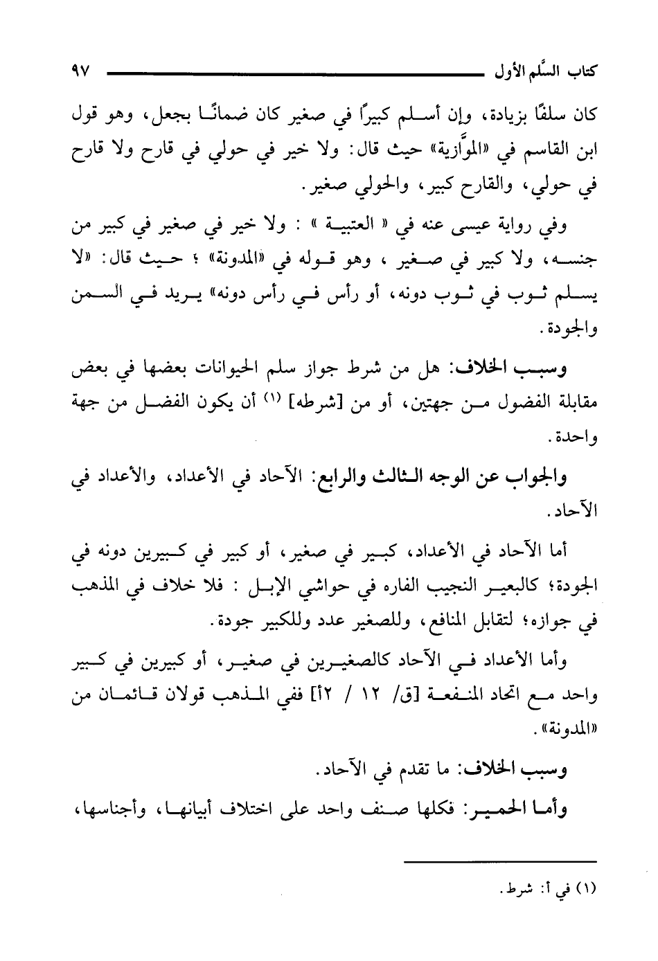 وفي رواية عيسى عنه في "العتبية": ولا خير في صغير في كبير من جنسه، ولا كبير في صغير، وهو قوله في "المدونة"؛ حيث قال: "لا يسلم ثوب في ثوب دونه، أو رأس في رأس دونه" يريد في السمن والجودة.