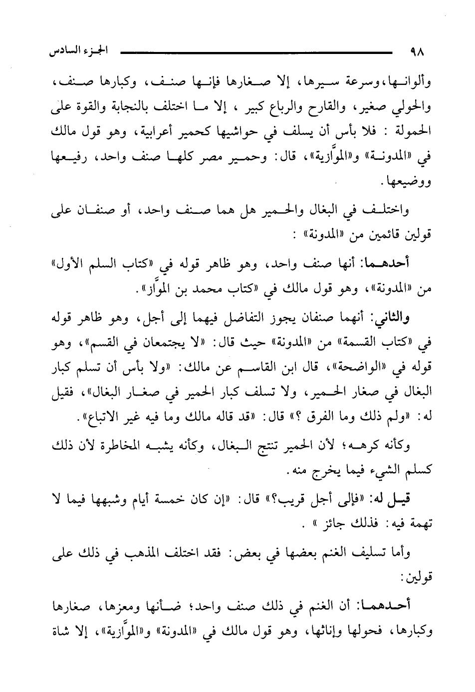 وألوانها، وسرعة سيرها، إلا صغارها فإنها صنف، وكبارها صنف، والحولي صغير، والقارح والرباع كبير، إلا ما اختلف بالنجابة والقوة على الحمولة: فلا بأس أن يسلف في حواشيها كحمير أعرابية، وهو قول مالك في "المدونة" و"الموَّازية"، قال: وحمير مصر كلها صنف واحد، رفيعها ووضيعها.