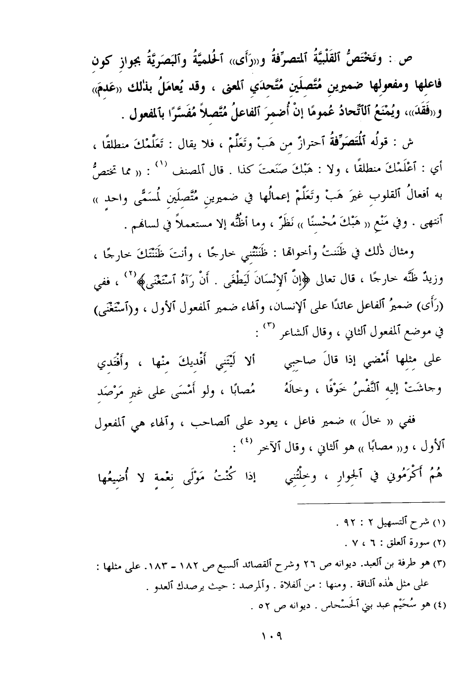 -[ص: وتختص القلبية المتصرفة و"رأى" الحلمية والبصرية بجواز كون فاعلها ومفعولها ضميرين متصلين متحدي المعنى، وقد يُعامل بذلك "عدم" و"فقد"، ويمنع الاتحاد عمومًا إن أضمر الفاعل متصلاً مفسرًا بالمفعول.]-