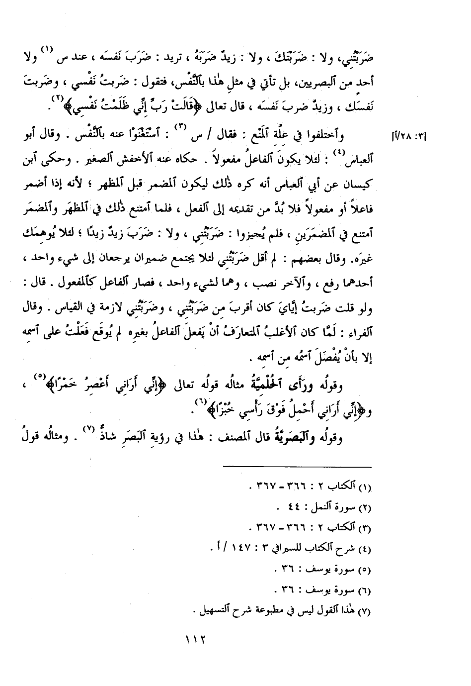 ضربتني، ولا: ضربتك، ولا: زيد ضربه، تريد: ضرب نفسه، عند س ولا أحد البصريين، بل تأتي في مثل هذا بالنفس، فتقول: ضربت نفسي، وضربت نفسك، وزيد ضرب نفسه، قال تعالى (قَالَتْ رَبِّ إِنِّي ظَلَمْتُ نَفْسِي).