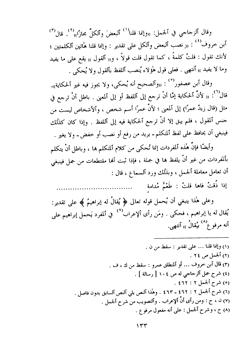 وقال الزجاجي في الجمل: "وإنما قلنا البعض والكل مجازًا". قال ابن خروف: "نصب البعض والكل على تقدير: وإنما قلنا هاتين الكلمتين؛ لأنك تقول: قلت كلمة، كما تقول قولًا، و"القول" يقع على ما يفيد وما لا يفيد" انتهى. فعلى قول هؤلاء ينصب اللفظ بالقول ولا يحكي.