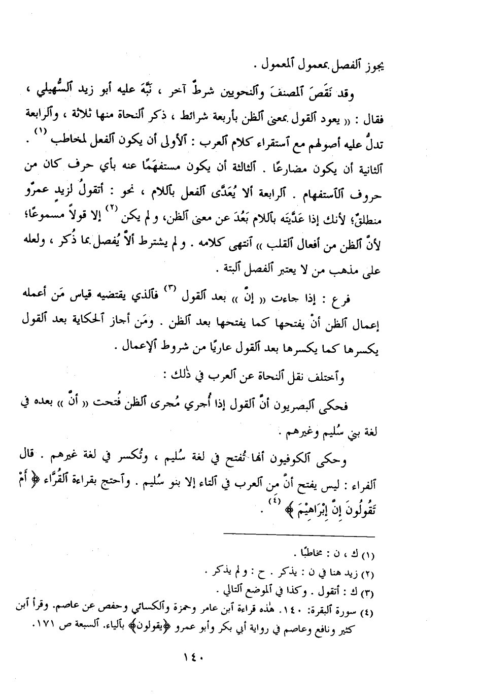 فرع: إذا جاءت "إن" يعد القول فالذي يقتضيه قياس من أعمله إعمال الظن أن يفتحها كما يفتحها بعد الظن. ومن أجاز الحكاية يعد القول يكسرها كما يكسرها بعد القول عاريًا من شروط الإعمال.