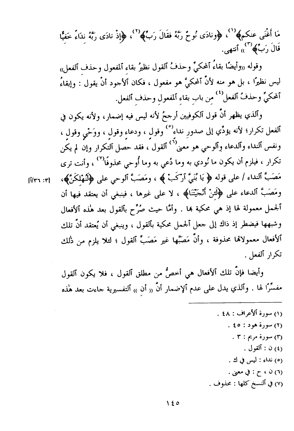 مَا أَغْنَى عَنكُمْ} {ونَادَى نُوحٌ رَّبَّهُ فَقَالَ رَبِّ} {إذْ نَادَى رَبَّهُ نِدَاءً خَفِيًا قَالَ رَبِّ} انتهى.
