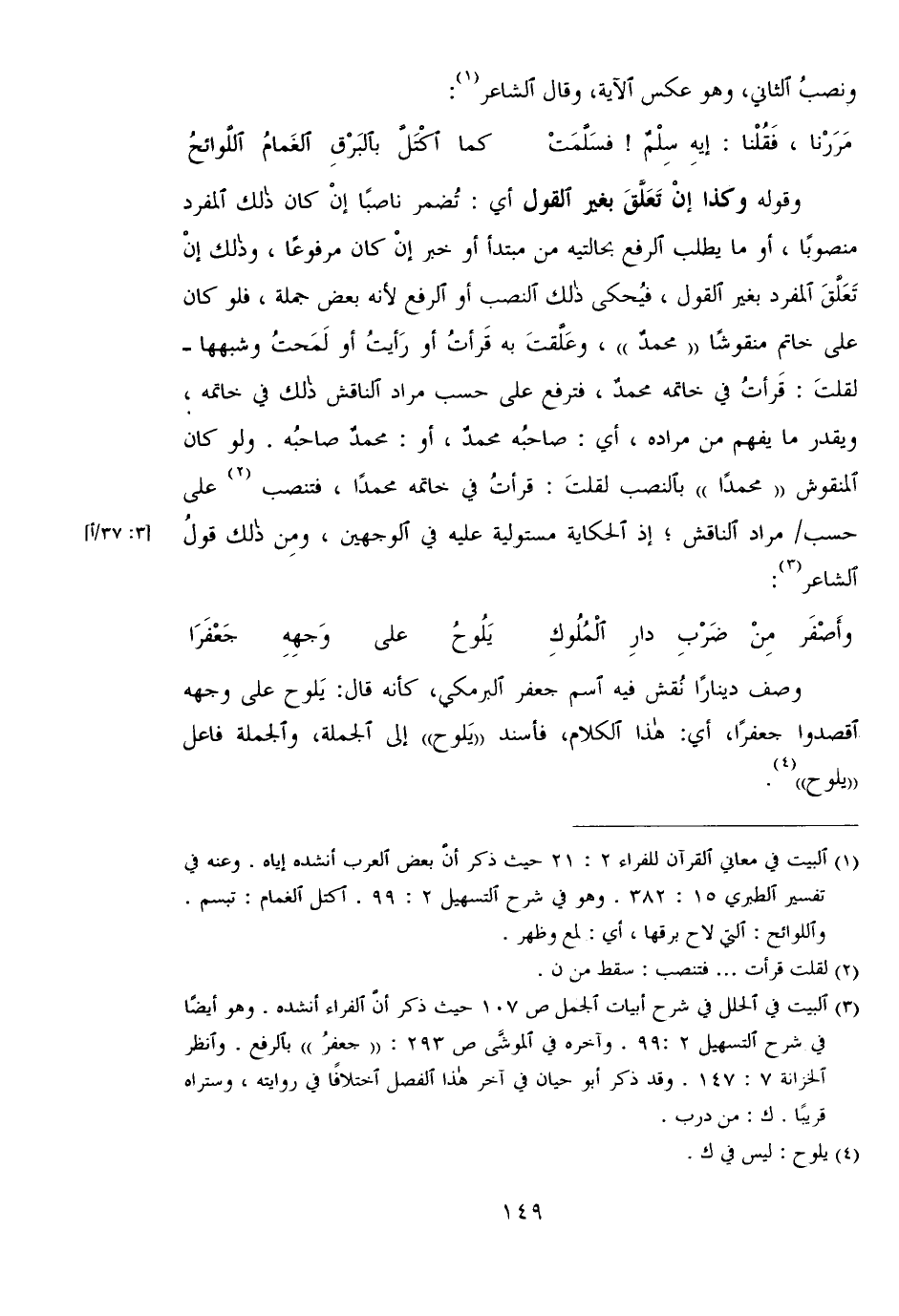 فيحكي ذلك النصب أو الرفع لأنه بعض جملة، فلو كان على خاتم منقوشا "محمد"، وعلقت به قرأت أو رأيت أو لمحت وشبهها-