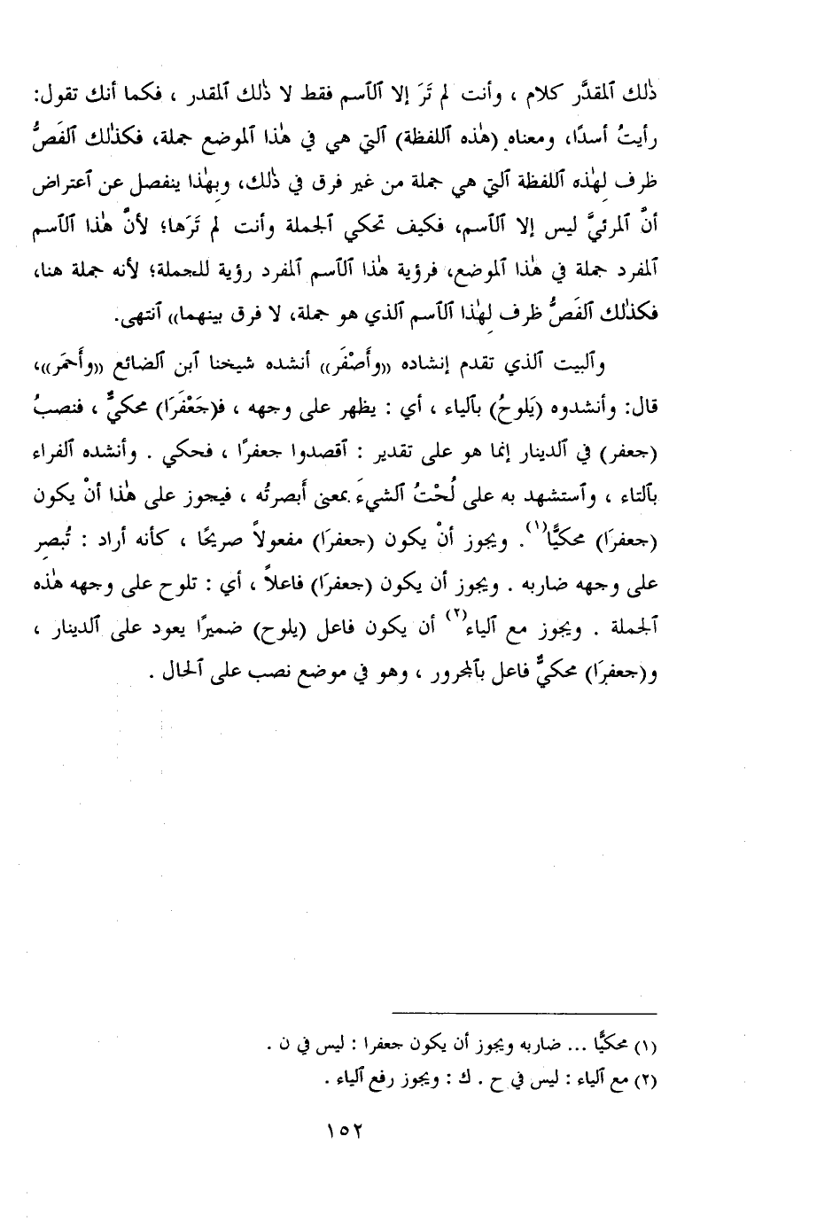 والبيت الذي تقدم إنشاده "وأصفر" أنشده شيخنا ابن الضائع "وأحمر", قال: وأنشده (يلوح) بالياء, أي: يظهر على وجهه, فـ (جعفرًا) محكي, فنصب (جعفر) في الدينار إنما هو على تقدير: اقصدوا جعفرًا, فحكي, وأنشده الفراء بالتاء, واستشهد به على لحت الشيء بمعنى أبصرته, فيجوز على هذا أن يكون (جعفرًا) محكيا, ويجوز أن يكون (جعفرًا) مفعولًا صريحًا, كأنه أراد: تبصر على وجهه ضاربة, ويجوز أن يكون (جعفرًا) فاعلًا, أي: تلوح على وجهه هذه الجملة, ويجوز مع الياء أن يكون فاعل (يلوح) ضميرًا يعود على الدينار, و (جعفرًا) محكي فاعل بالمجرور, وهو في موضع نصب على الحال.