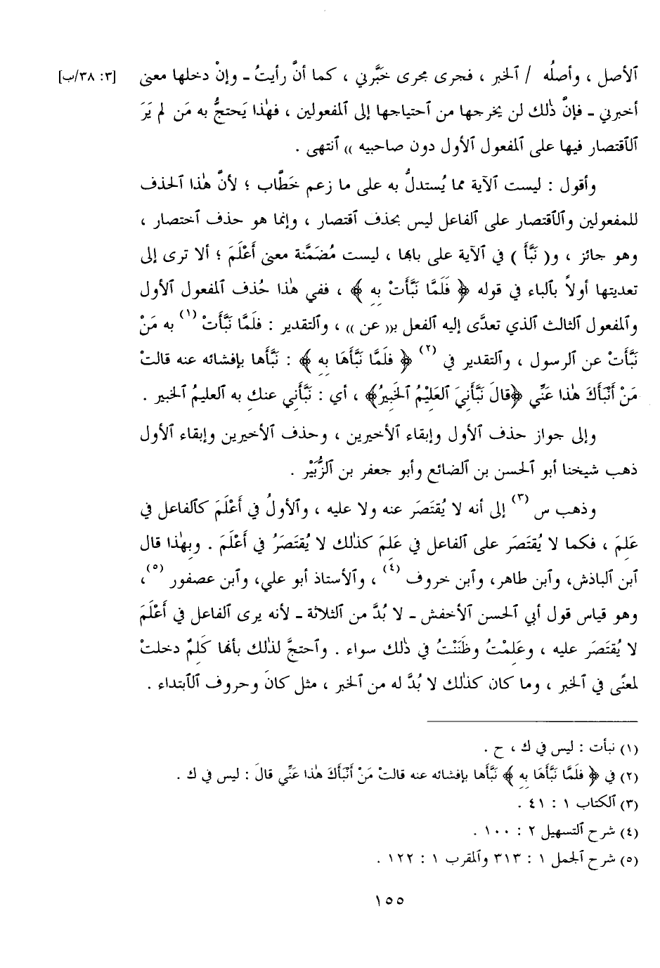 وأقول: ليست الآية مما يستدل به على ما زعم خطاب, لأن هذا الحذف للمفعولين والاقتصار على الفاعل ليس بحذف اقتصار, وإنما هو حذف اختصار, وهو جائز, و (نبأ) في الآية على بابها, ليست مضمنة معنى أعلم, ألا ترى إلى تعديتها أولًا بالباء في قوله} فَلَمَّا نَبَّأَهَا بِهِ {: نبأها بإفشائه عنه قالت من أنبأك هذا عني} قَالَ نَبَّأَنِيَ الْعَلِيمُ الْخَبِيرُ {, أي: نبأني عنك به العليم الخبير.