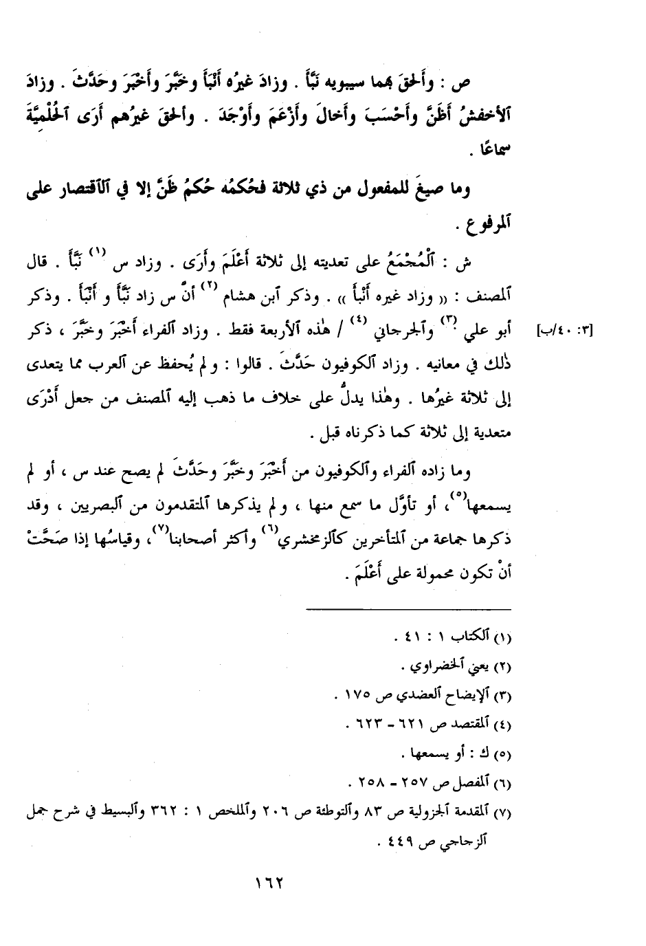 وما زاده الفراء والكوفيون من أخبر وخبر وحدث لم يحص عند س, أو لم يسمعها, أو تأول ما سمع منها, ولم يذكرها المتقدمون من البصريين, وقد ذكرها جماعة من المتأخرين كالزمخشري وأكثر أصحابنا, وقياسها إذا صحت أن تكون محمولة على أعلم.