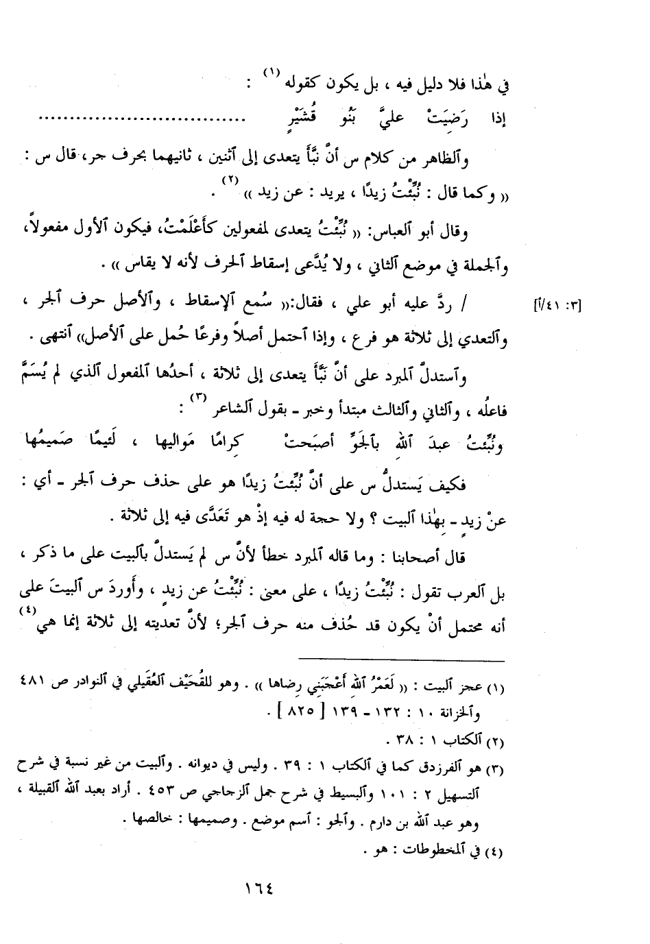 فكيف يستدل س على أن نبئت زيدًا هو على حذف حرف الجر - أي: عن زيد - بهذا البيت؟ ولا حجة له فيه إذ هو تعدى فيه إلا ثلاثة.