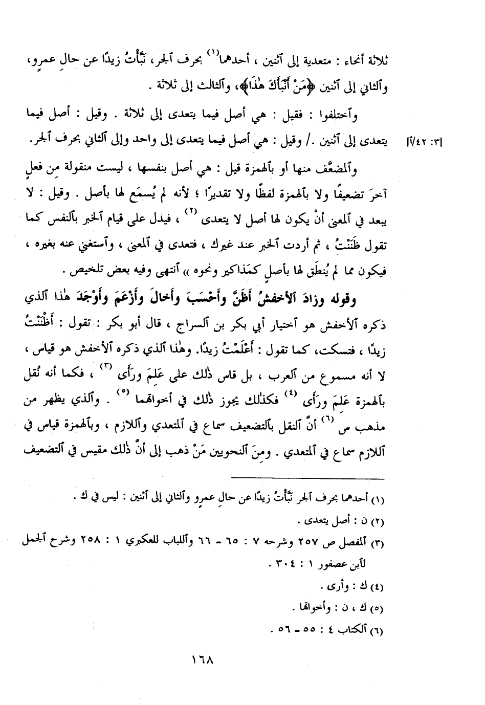 وقوله وزاد الأخفش أظن وأحسب وأخال وأزعم وأوجد هذا الذي ذكره الأخفش هو اختيار أبي بكر بن السراج, قال أبو بكر: تقول: أظننت زيدًا, فتسكت, كما تقول: أعلمت زيدًا, وهذا الذي ذكره الأخفش هو قياس, لا أنه مسموع من العرب, بل قاس ذلك على علم ورأي, فكما أنه نقل بالهمزة علم ورأى فكذلك يجوز ذلك في أخواتهما, والذي يظهر من مذهب س أن النقل بالتضعيف سماع في المتعدى واللازم, وبالهمزة قياس في اللازم سماع في المتعدي, ومن النحويين من ذهب إلى أن ذلك مقيس في التضعيف