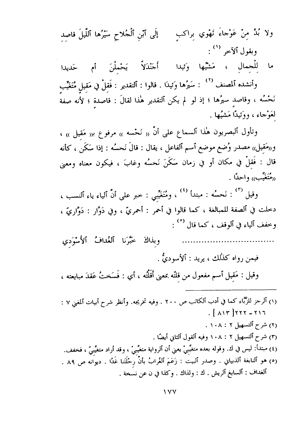 وأنشده المصنف: سيرها وئيدًا, قالوا: التقدير: فقل في مقيل متغيب نحسه, وقاصدًا سيرها؛ إذ لو لم يكن التقدير هذا لقال: قاصدة؛ لأنه صفة لعوجاء, ووئيدًا مشيها.